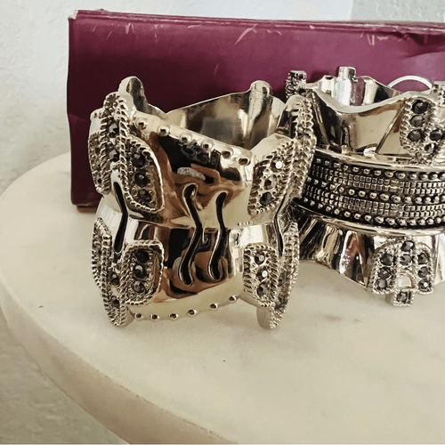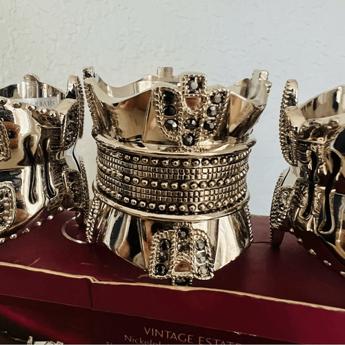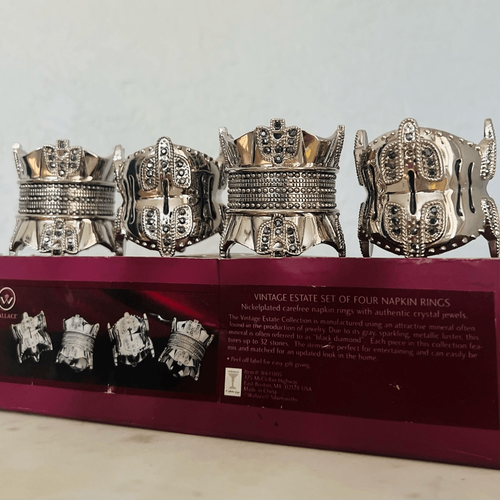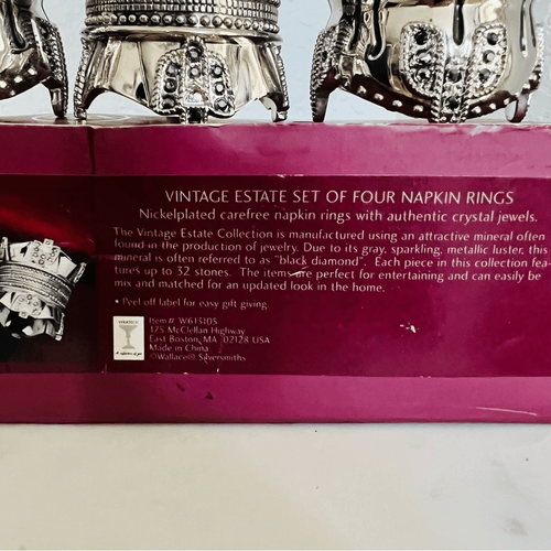 For sale is a divine, unused boxed set of four, quality-crafted, Wallace Silversmiths 'Vintage Estate' Nickel Plated Napkin Rings, with 'Black Diamond' Authentic Crystals!