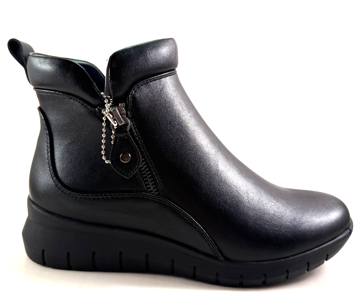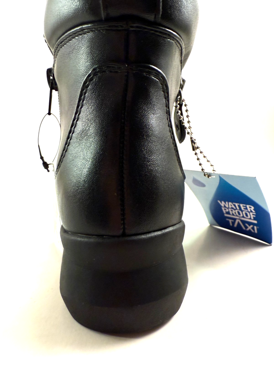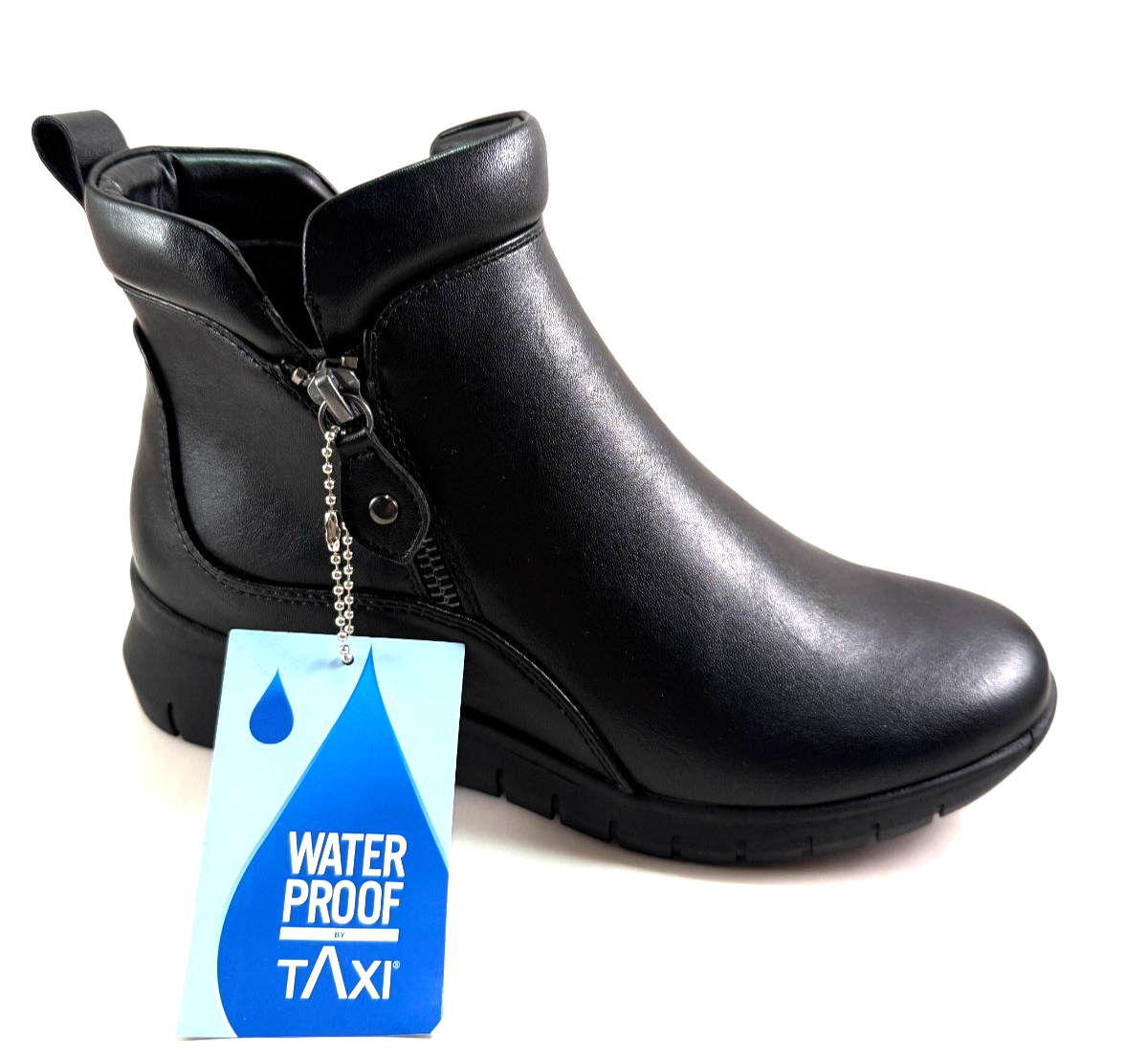 The Taxi by Sean Alan Jolene-01 Black Low Wedge Heel Waterproof Winter Ankle Bootie is a stylish and practical choice for women in the colder seasons. Featuring a round toe, zip closure, and fleece lining, these boots offer both comfort and convenience. The low wedge heel provides support while the waterproof design ensures feet stay dry, making them perfect for travel, casual outings, or workwear.