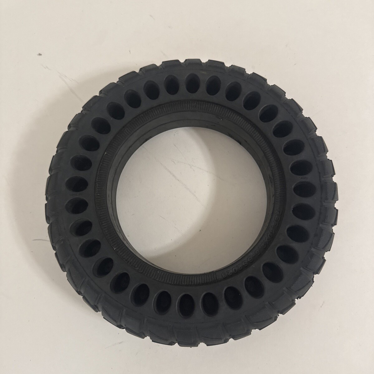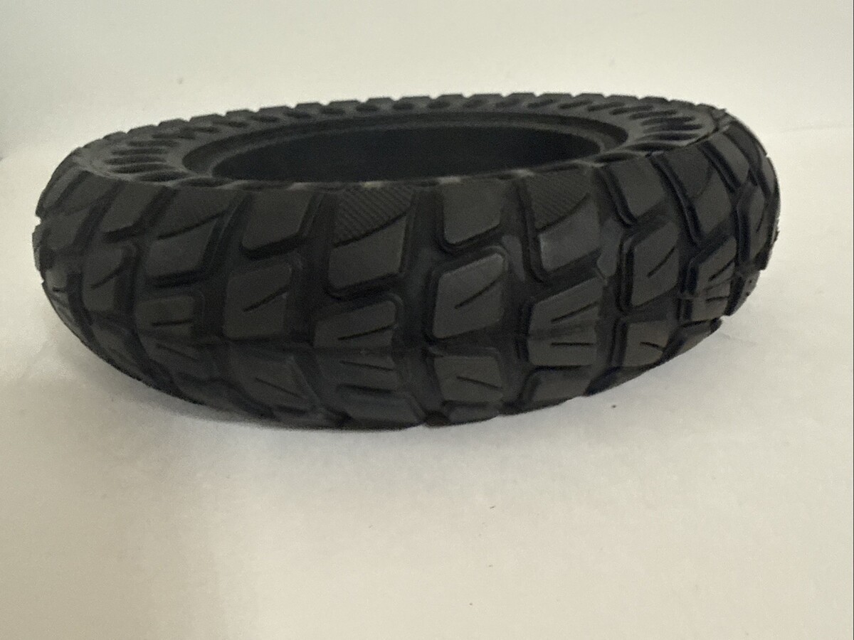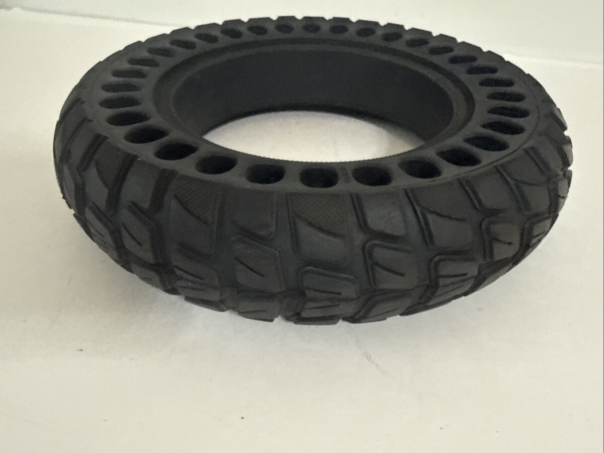 The 10 inch off-road solid tire by Miracle Moving is specifically designed for electric scooters, with a durable solid rubber construction for maximum traction and anti-slip performance. This all-season tire has a 2.5 inch section width and a 9.5 inch overall diameter, suitable for a variety of terrains. Made in China, this tire is a reliable choice for enhancing the performance and durability of your electric scooter.