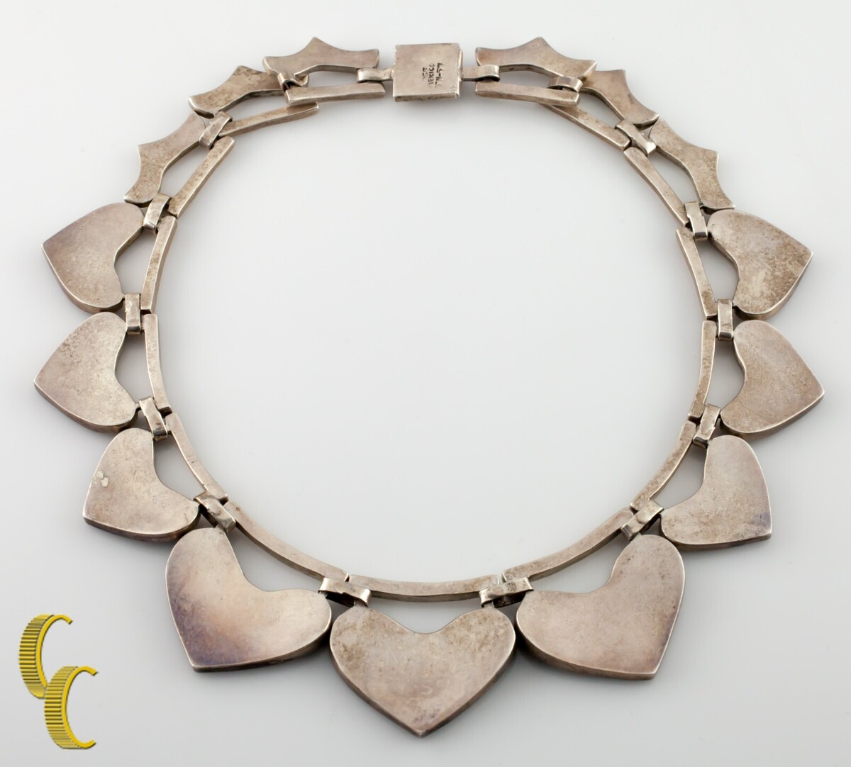 Taxco Mexico Sterling Silver Onyx Inlay Heart Dangle Choker Necklace