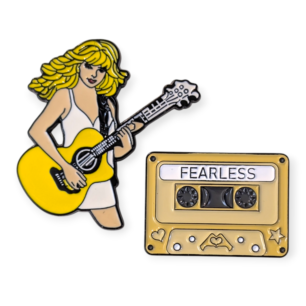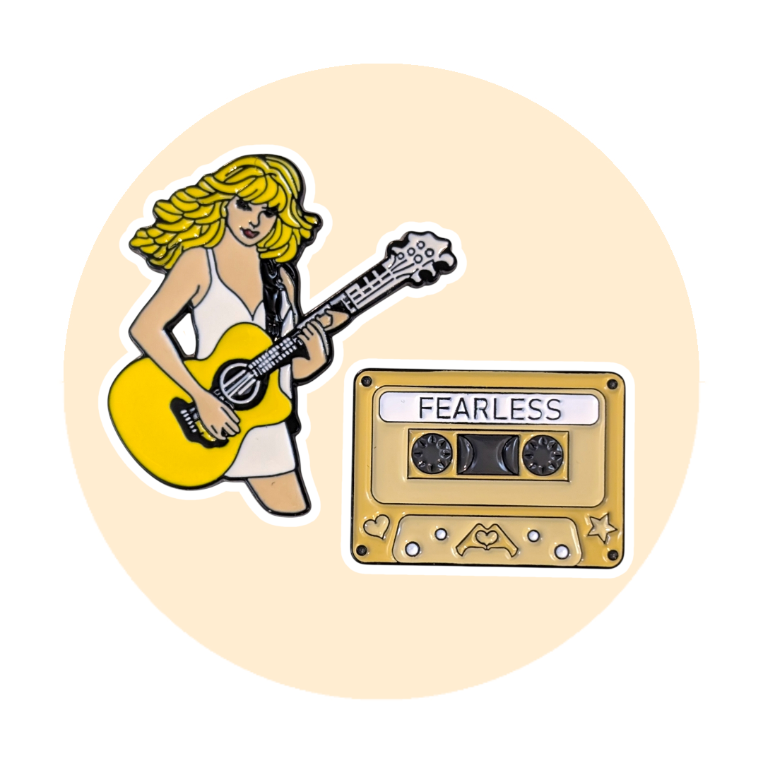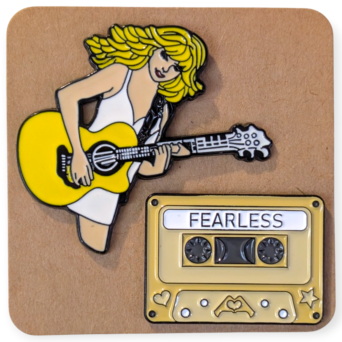Girly Pop Music Enamel Pin: Taylor Swift Blonde with Guitar, Fearless Cassette