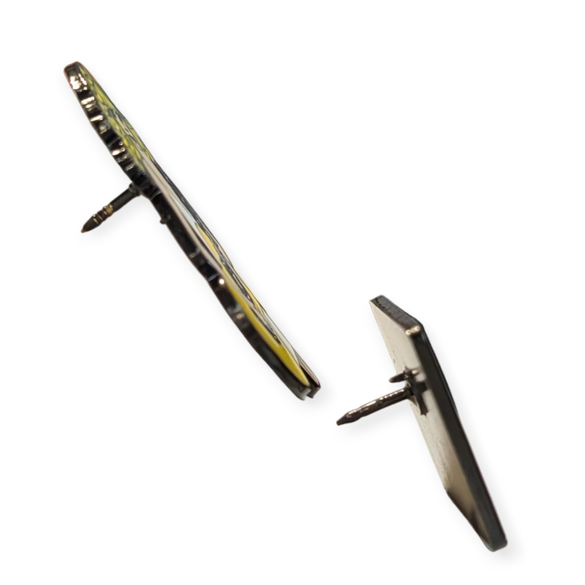 • Sculpted metal with enamel, and finished with rubber backs to keep secure.