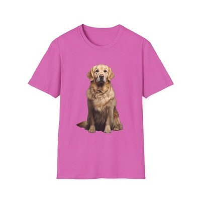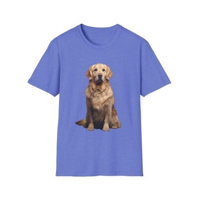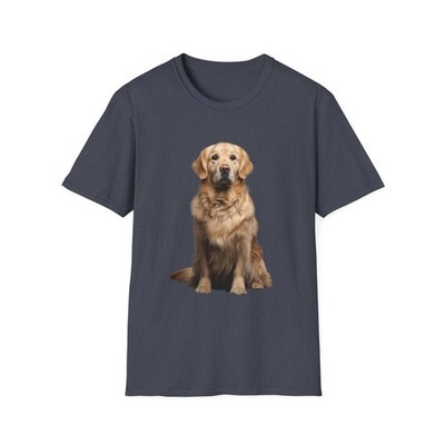 Sunlight warms the fur. A golden retriever?s open-mouthed grin is printed at chest height, the kind of image that makes you slow down and smile on a busy day. This lightweight crew tee drapes casually over weekend hikes, coffee runs, and evenings on the porch. The fabric is soft against skin and smooth for crisp printing, so every hair, highlight, and warm expression of the dog comes through with friendly clarity. Wear it when you want comfort that whispers nostalgia ? muddy paws, river walks, and the steady company of a good dog come to mind. The understated, classic cut keeps the focus on the joyful retriever illustration so it fits easily into a layered outfit or stands alone on a sunny afternoon out with friends or family.