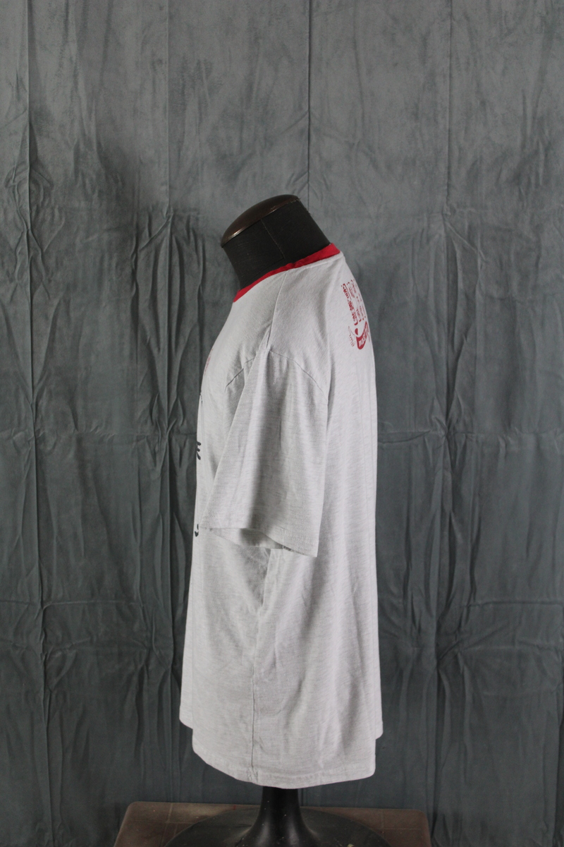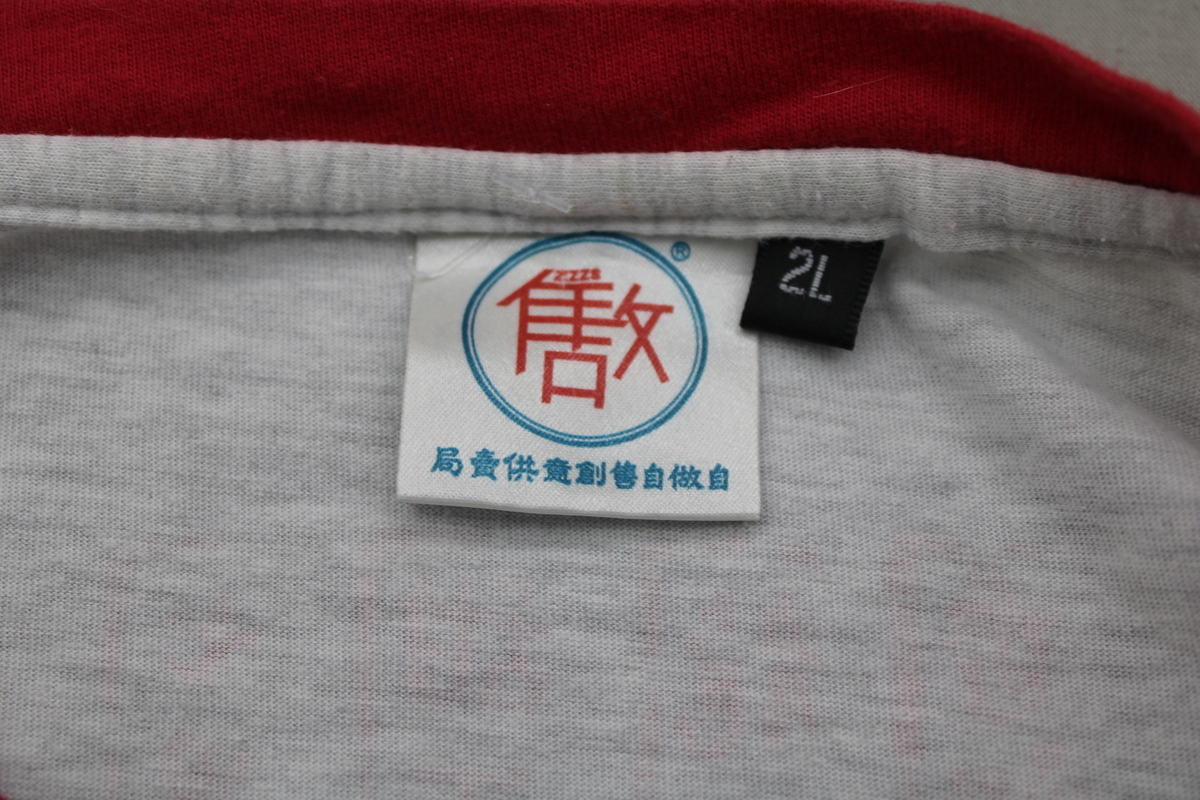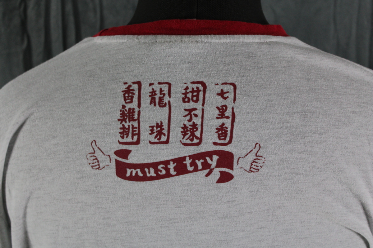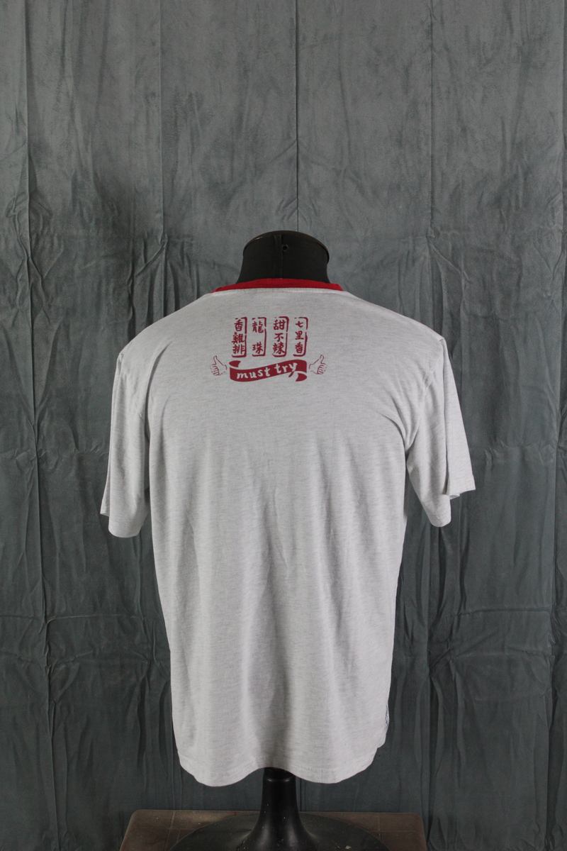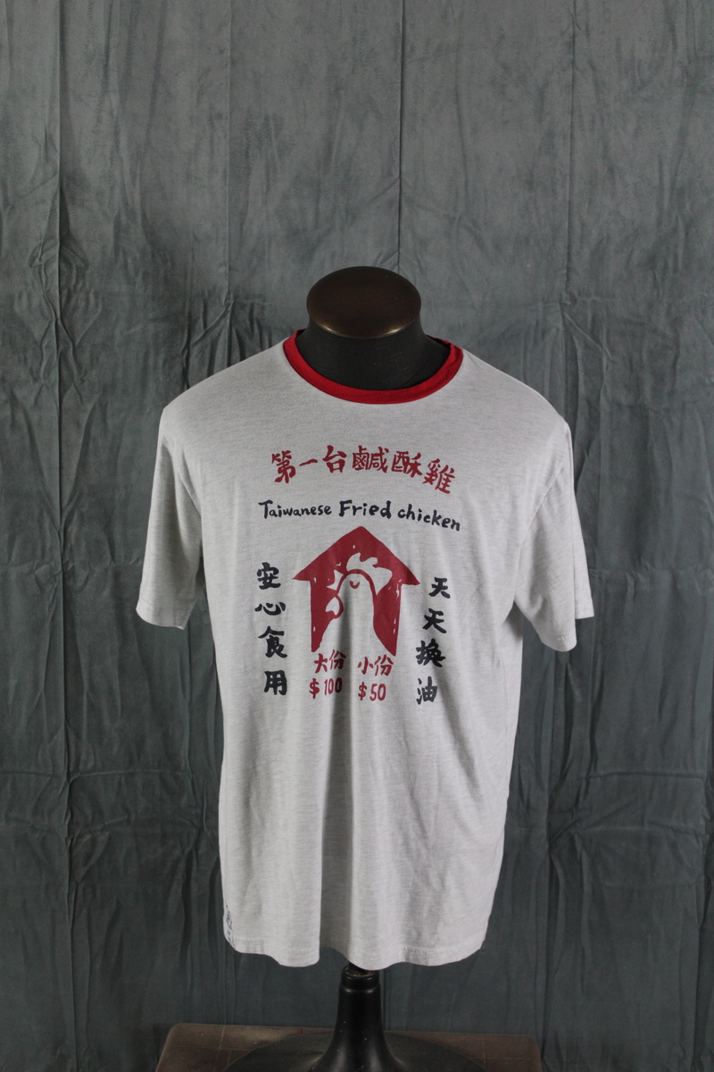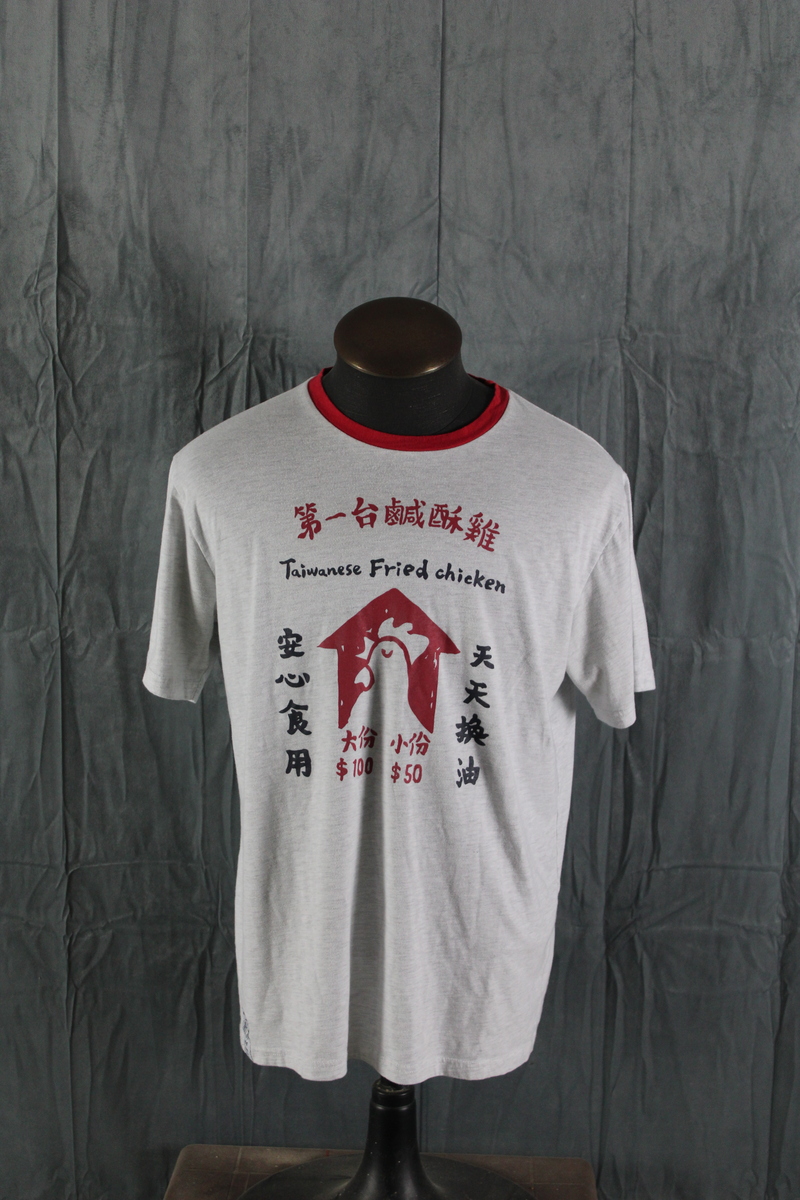 Up for sale is a Taiwan Streetwear shirt by Proud. It has a grey base colour with a red collar. The front of the shirt has a graphic for Taiwan fried Chicken on the chest with 100 years on the back underneath the neck. What a great shirt do not miss out on it.