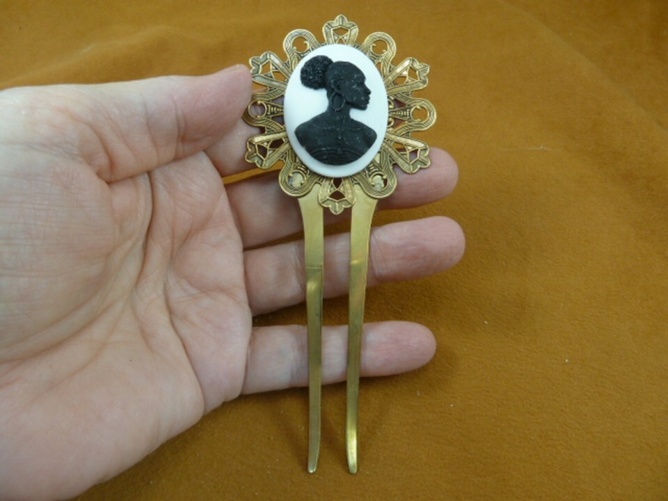CAH20-1) RARE African American LADY black + white CAMEO Hairpin hair pin comb