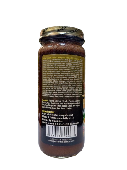 Organic Aloevera Honey with Flaxseed Black Seed has powerful anti-inflammatory effects and strong antioxidant. This combination is the most effective nutritional supplement in the world due to its wonder full and amazing Properties. This combination has been used for thousands of years as a medicinal herb increasing the speed of wound healing process. It is used for arthritis, heartburn (dyspepsia), joint pain, stomach pain, Crohn's disease and ulcerative colitis, bypass surgery, hemorrhage, diarrhea, intestinal gas, stomach bloating, loss of appetite, jaundice, liver problems, Helicobacter pylori (H. pylori) infection, stomach ulcers, irritable bowel syndrome (IBS), gall bladder disorders, high cholesterol, a skin condition called lichen plan us, skin inflammation from radiation treatment, and fatigue. It is also used for headaches, bronchitis, colds, lung infections, fibromyalgia, leprosy, fever, menstrual problems, itchy skin, recovery after surgery, and cancers. Other uses include depression, Alzheimer's disease, swelling in the middle layer of the eye (anterior uveitis), diabetes, water retention, worms, an autoimmune disease called systemic lupus erythematosus (SLE), tuberculosis, urinary bladder inflammation, and kidney problems. If you do get a cold, a cough or the flu, you can feel better sooner by mixing one teaspoon in a glass of warm milk or tea and drinking it once daily.
