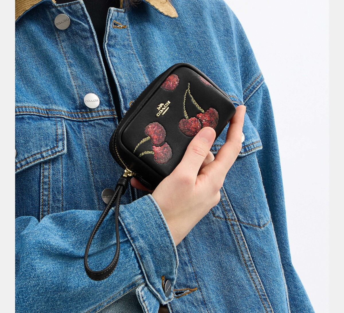 Coach Coated Leather Pouch Wristlet w/ Cherry Print ~NWT~ CDF01 Black