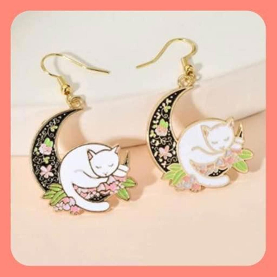 New Adorable Sleeping Kitty ??? On The Moon ? Enamel Earrings