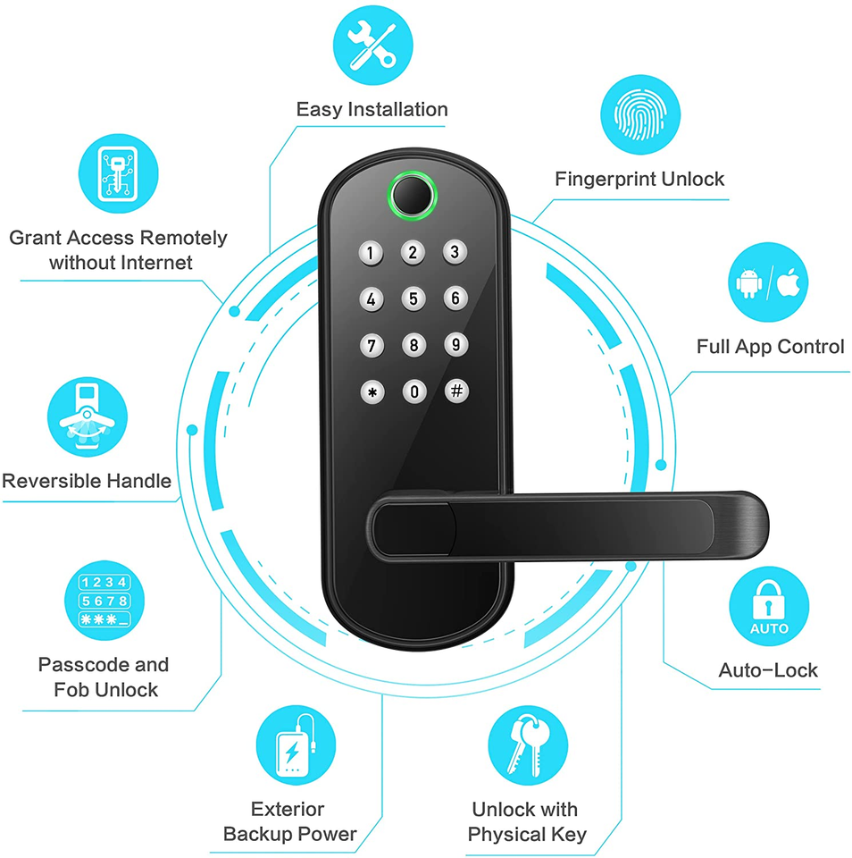 [Advanced 3D Fingerprint] Unlock the door less than 0.3 seconds with our 3rd generation fingerprint access technology. The most secured 5-in-1 Keyless Entry Smart Door Lock: Fingerprint + Passcode + Fob + Smartphone + Key.