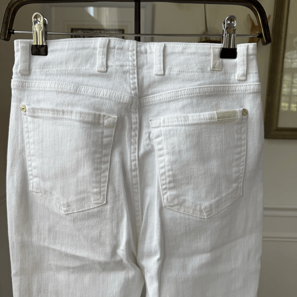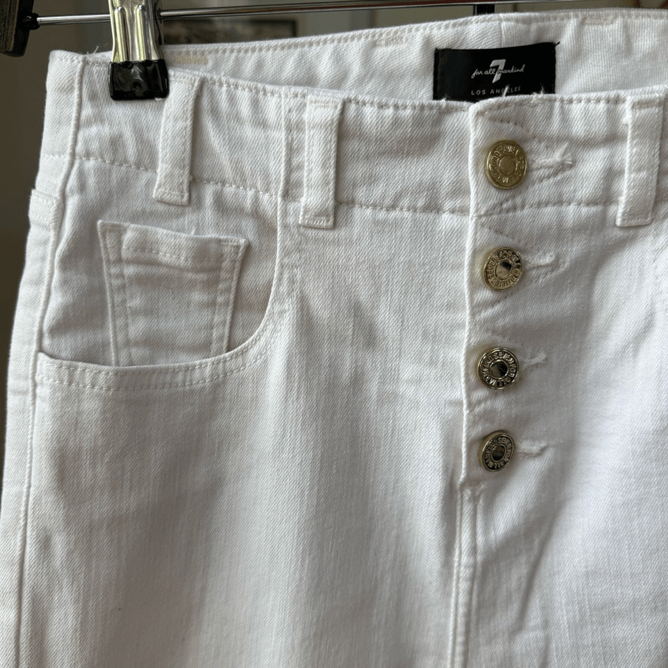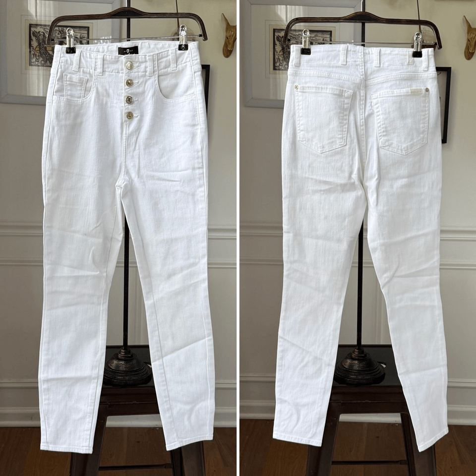 7 for all Mankind white high-rise crop skinny jeans with button fly. The best part about these jeans is the buttons are gold tone. Cotton polyester and spandex blend. Laying flat measures 13 inches straight across the waist with an 11 inch rise and a 26? inseam. $248 inseam.