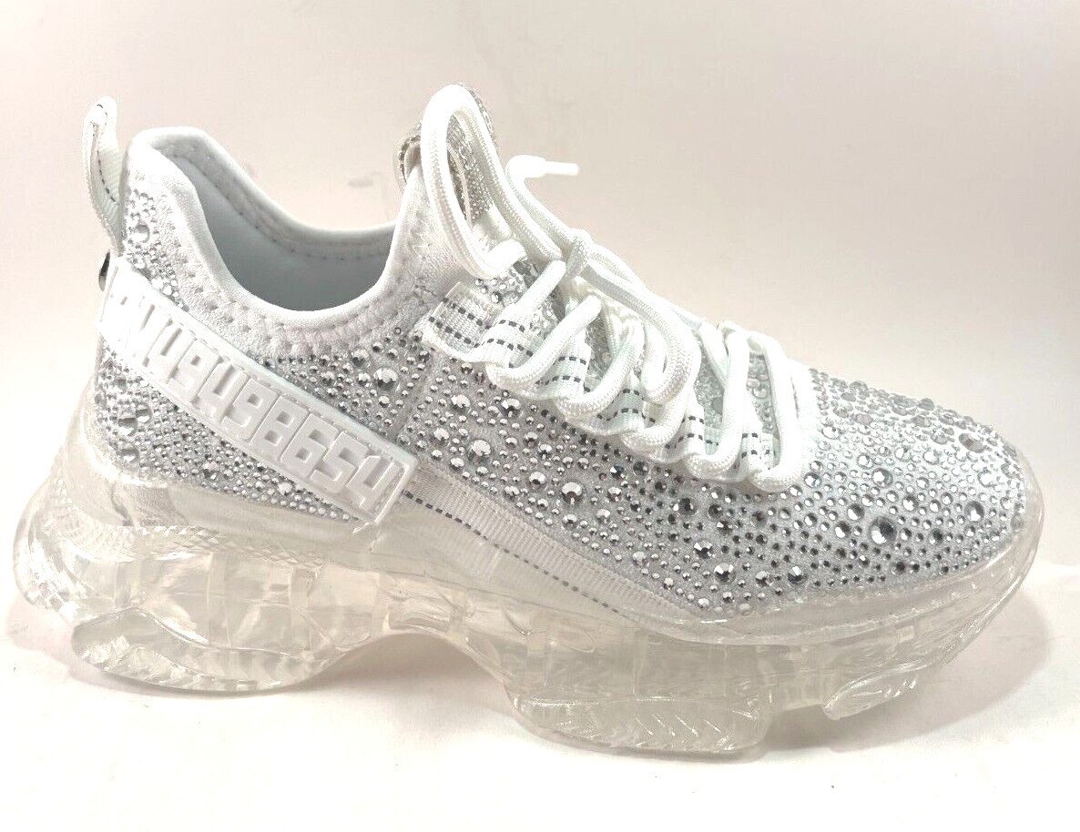 The shoe has a mid-top design and synthetic upper material, making it suitable for both fall and spring seasons. The shoe is adorned with rhinestone accents that add a touch of glamour to any outfit. The sneaker is available in sizes 5-9 and is perfect for athletic use.