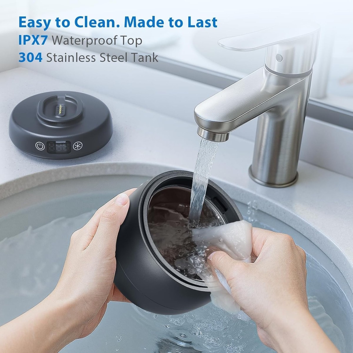 IPX7 Waterproof Stainless Steel Tank for Easy Maintenance: Cleanup is quick and simple. The upper body is IPX7 waterproof, allowing you to rinse it directly under the tap. CANHOPE denture cleaner features a durable, corrosion-resistant 304 stainless steel tank that prevents odors and is built to last. The split-design base is splash-proof for added convenience.