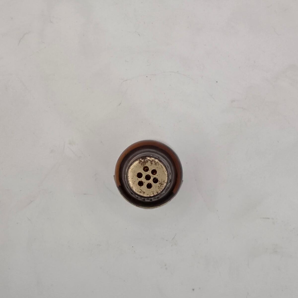 Vintage amber glass souvenir shaker bottle from Mission, Texas featuring a Western cowboy scene label and a perforated metal shaker top. Base is embossed ?Motel Buffalo Pat Pend,? indicating a mid-century tourist motel gift shop item. Bottle stands about 3 inches tall and is empty inside. The label shows some age wear but remains readable and displays well. A great piece of Texas roadside Americana.