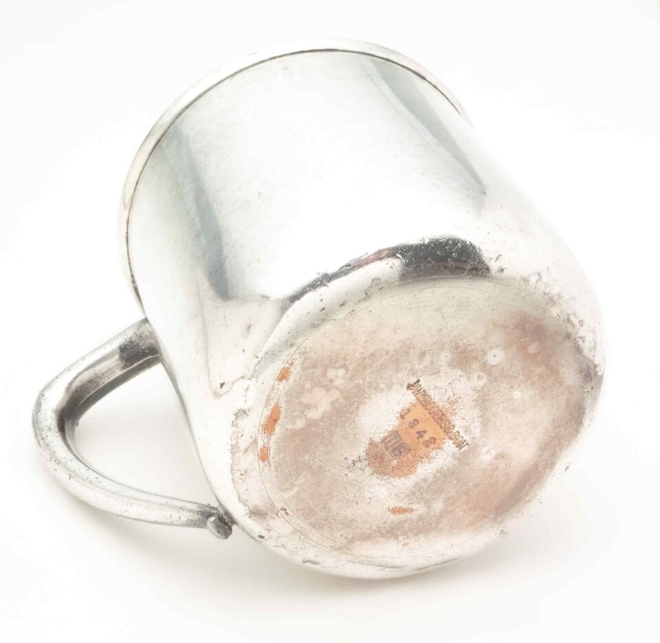 Condition: There are fine scratches, a couple minor dents on the bottom and staining/water marks on the silver-plate on the exterior of the cup, which mostly shows when you reflect white onto the cup. It has a high polished reflective mirror-like finish. The bottom inside is worn down, exposing the copper base evenly. The bottom exterior shows the copper in a couple of patches. Overall, for a cup that is 84 years old, it is in nice shape.