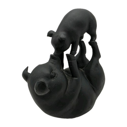? This Hog Heavens Yoga Pig Figurine is made of designer composite resin, hand painted and polished in clay finish. Color Tone may vary slightly from pictures.