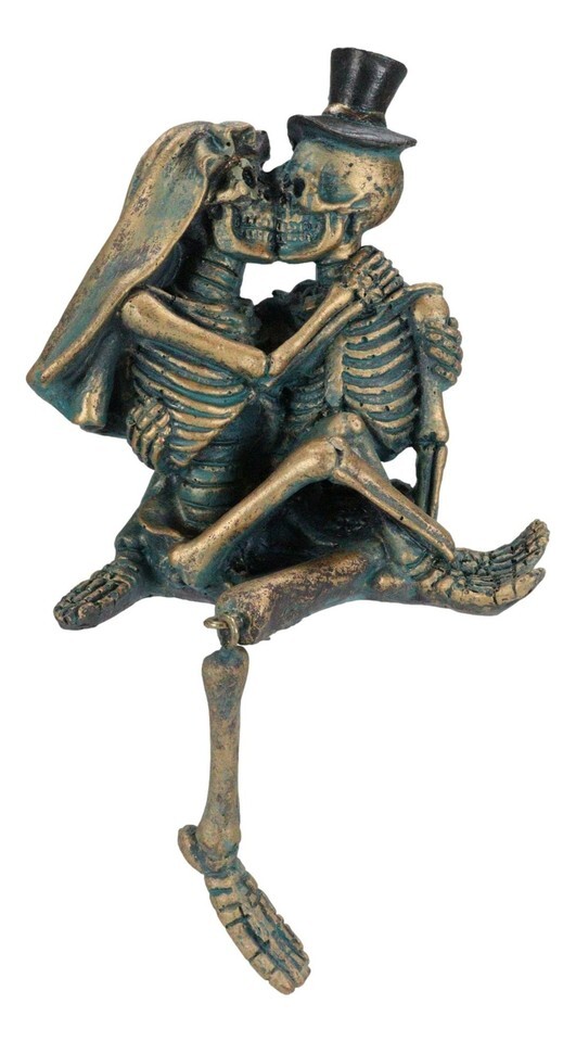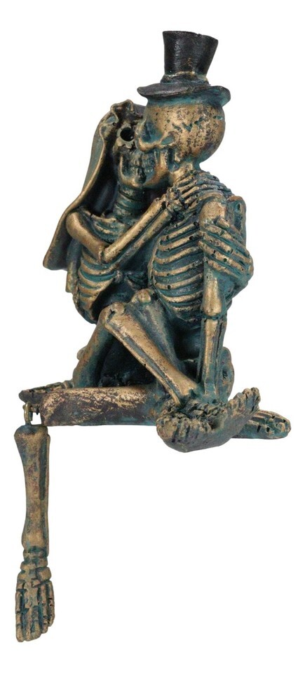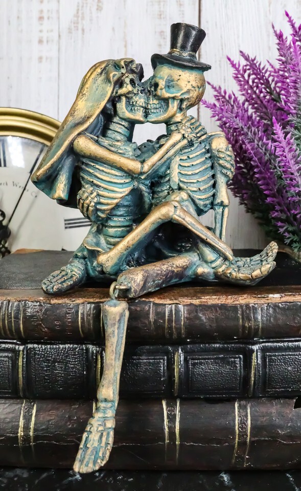 ? With eternity ahead of them, this skeleton couple is in no rush to go anywhere anytime soon. They are happy to just sit kissing each other till 'Kingdom Comes'. The bride has her veil on her head pulled behind her hair while the groom still has his tuxedo black top hat. This sculpture is perfect as decors for edge surfaces, like your wall shelves, cabinet shelves, desk or tables and many more!