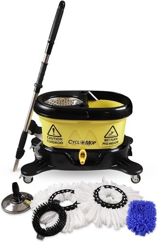 The Casabella Clean Water Spin Mop features two buckets that work together, allowing for separation of clean and dirty water, making it easier to fill with clean water in any sink and discard dirty when done, and for easy storage anywhere. It has an easy-to-use pedal spinner and spinning handle grip while also featuring a removable splash guard for cleaning.