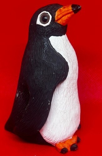 (internal #Y-PEN-38) Natural soapstone figurine of a PENGUIN (TAN GRAY WHITE RUST RED marbled natural color) is 1-3/8" tall, crafted in Peru. Good detail. New, no defect.