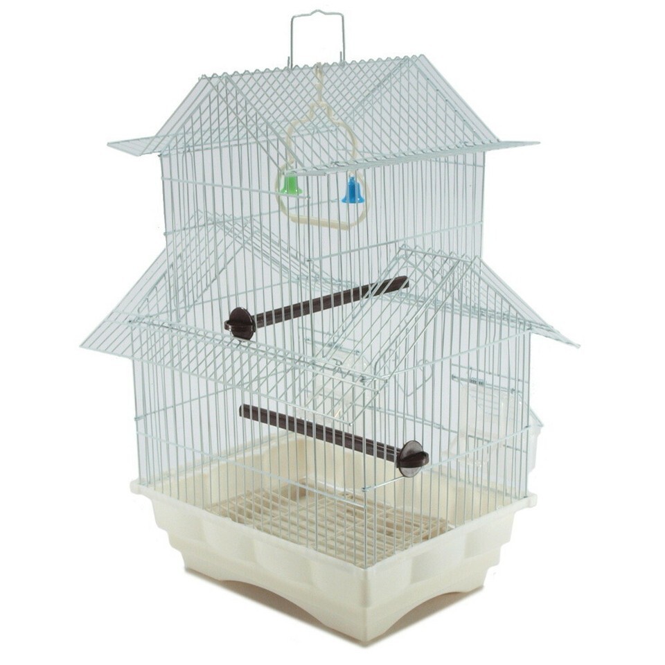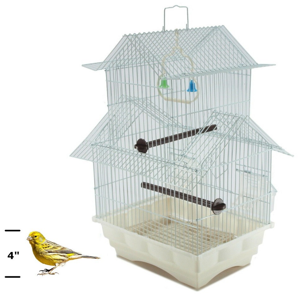 House Style Economy Bird Cage is an economical cage for your parakeet or other small bird. Two plastic cups, two plastic perches, one swing and a pull-out debris tray are included. Pet House measures 8.25?? Long, 11.25?? Wide and 18?? High with .4?? wire spacing. The carrying handle makes this small bird cage ideal for use as a travel bird cage.