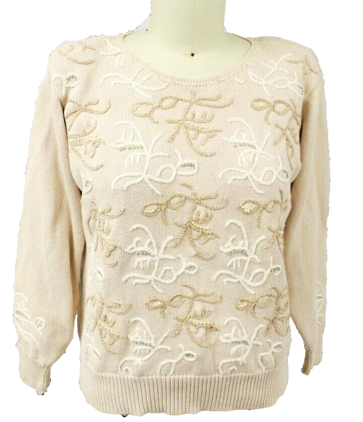 VTG 80s Jeanne Pierre Pink Cotton Sweater M Big Shoulders Embroidered Costume