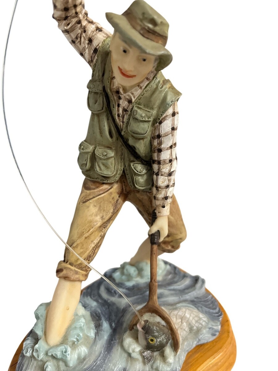 The fishing rod and line are intact and add height and motion to the piece, making it a strong display figurine for a shelf, desk, or cabin-style decor. Unmarked.