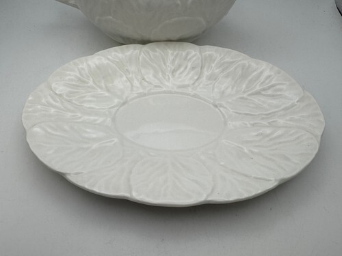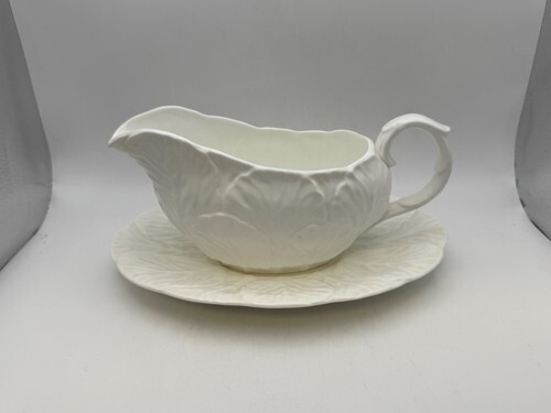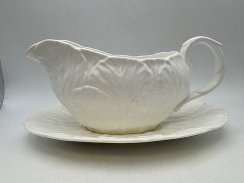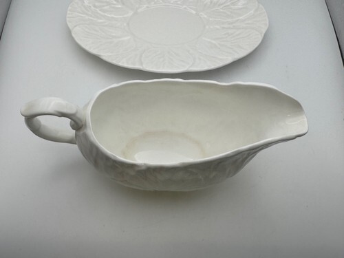 The gravy boat measures 8 1/2" from spout to handle while the plate measures 9" x 6 1/8". It is in very good estate condition with no chips, cracks, or excessive wear.