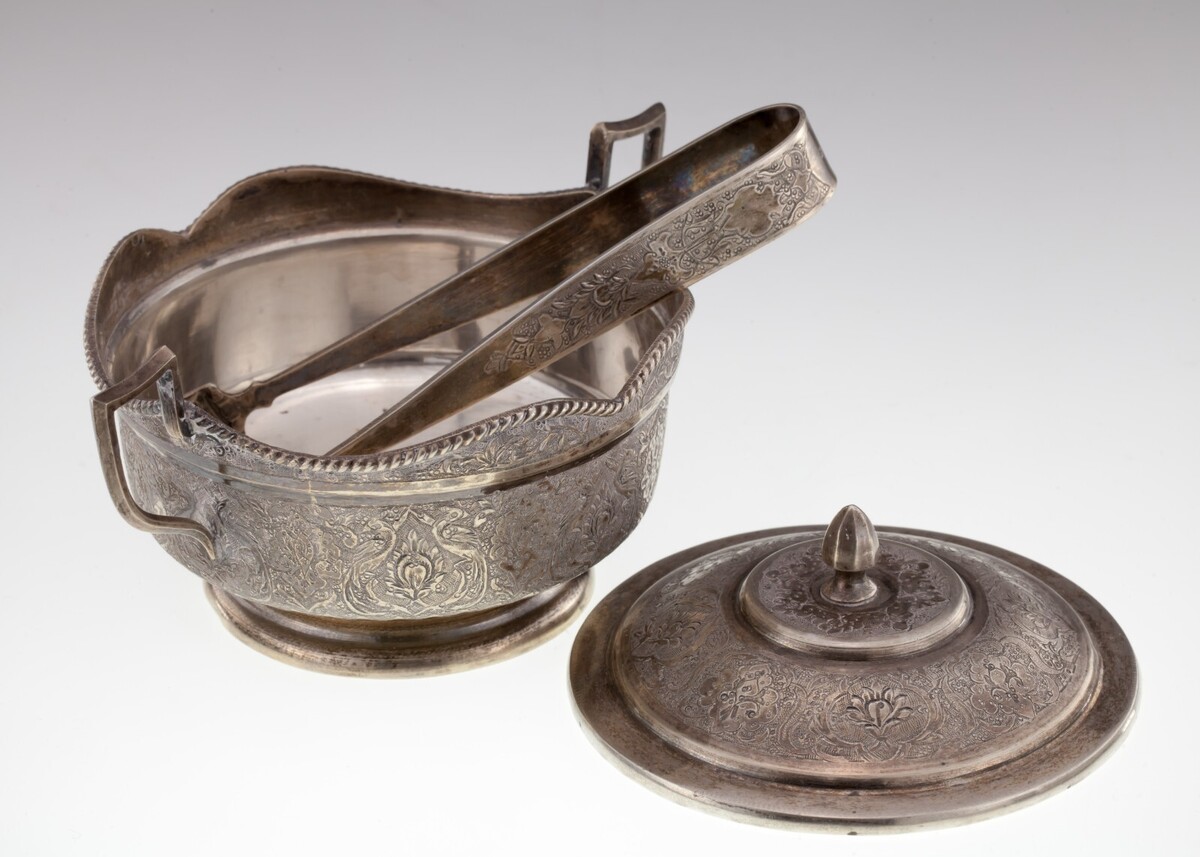 Persian Silver Etched Sugar Bowl with Tongs and 39 similar items