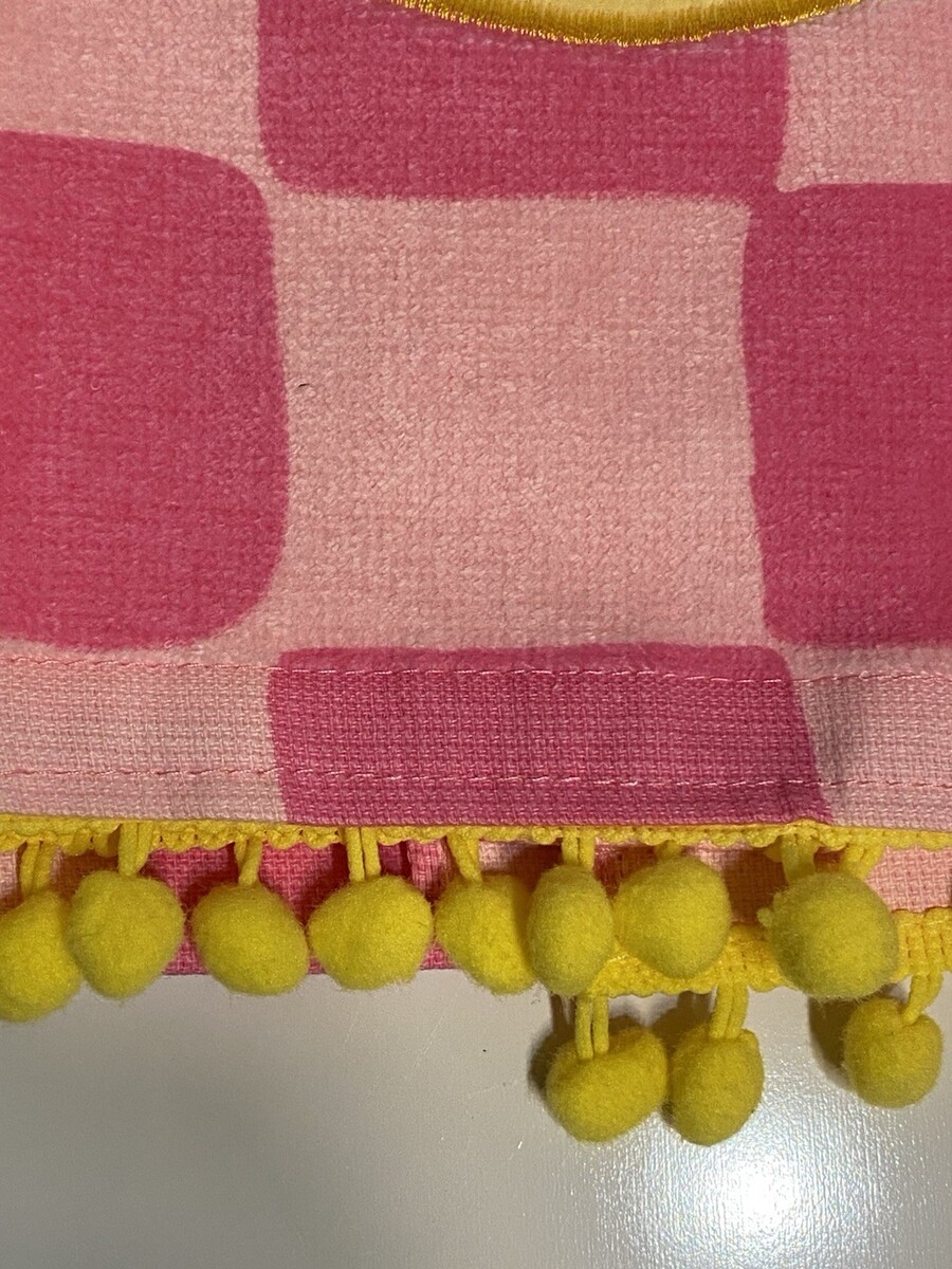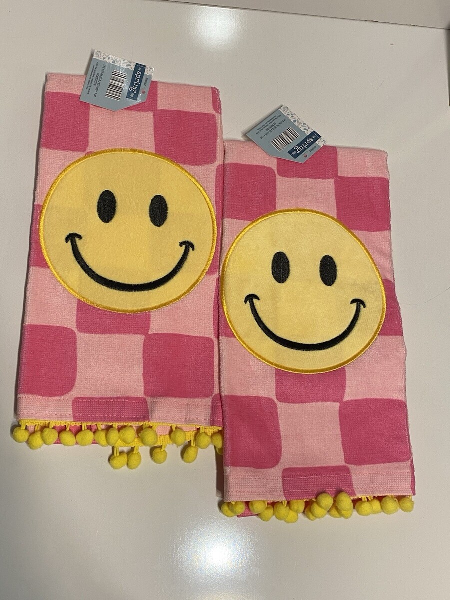 LOT of 2 Kitchen Dish or Bathroom Hand Towels Bath Set Pink Smiley Face PomPoms