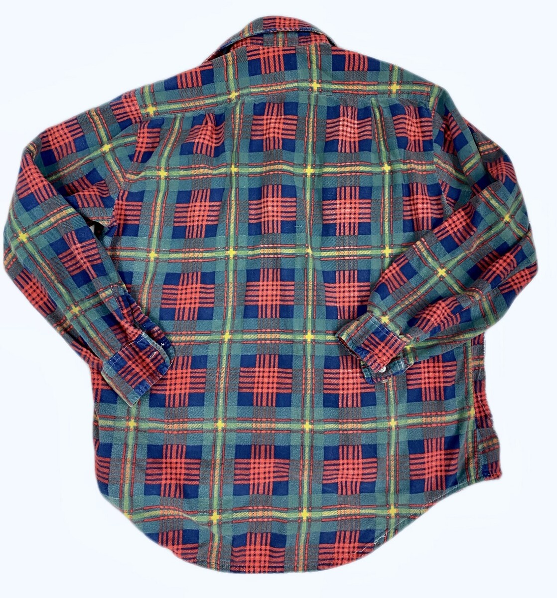 Vintage Big Smith men?s flannel shirt in bold red and yellow plaid. Made of 100% cotton flannel with a rugged mid-weight hand, this shirt embodies classic American workwear style.