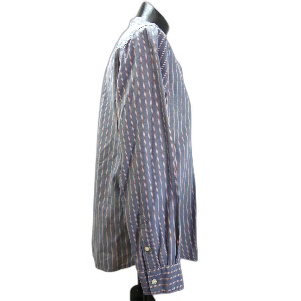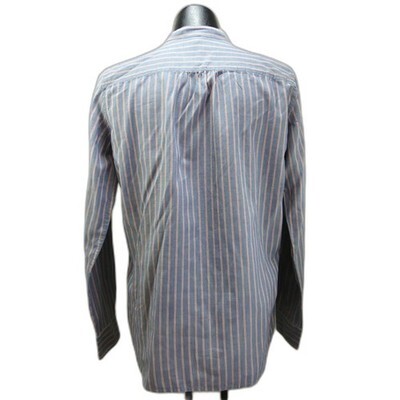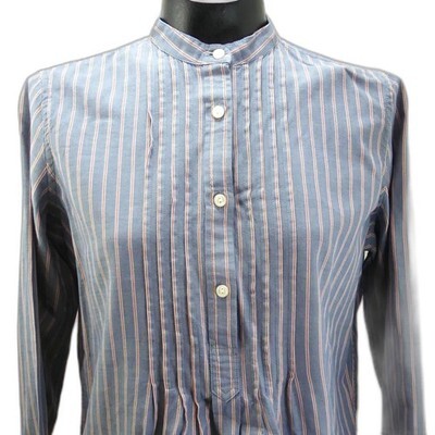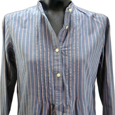 Lauren Jeans Company Ralph Lauren women's size Small blue striped tunic style blouse is in excellent condition, gently worn. Blue with red and white stripes with mandarin collar, four-button tunic front with pintucks on either side of the button placket. Long sleeves with one-button cuffs and button in placket. Gathered at yoke center back, shirt tail hem. 100% Cotton; Machine Wash.