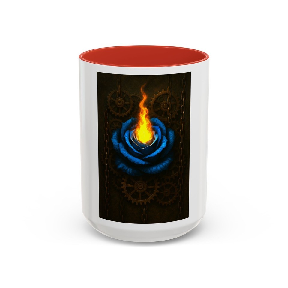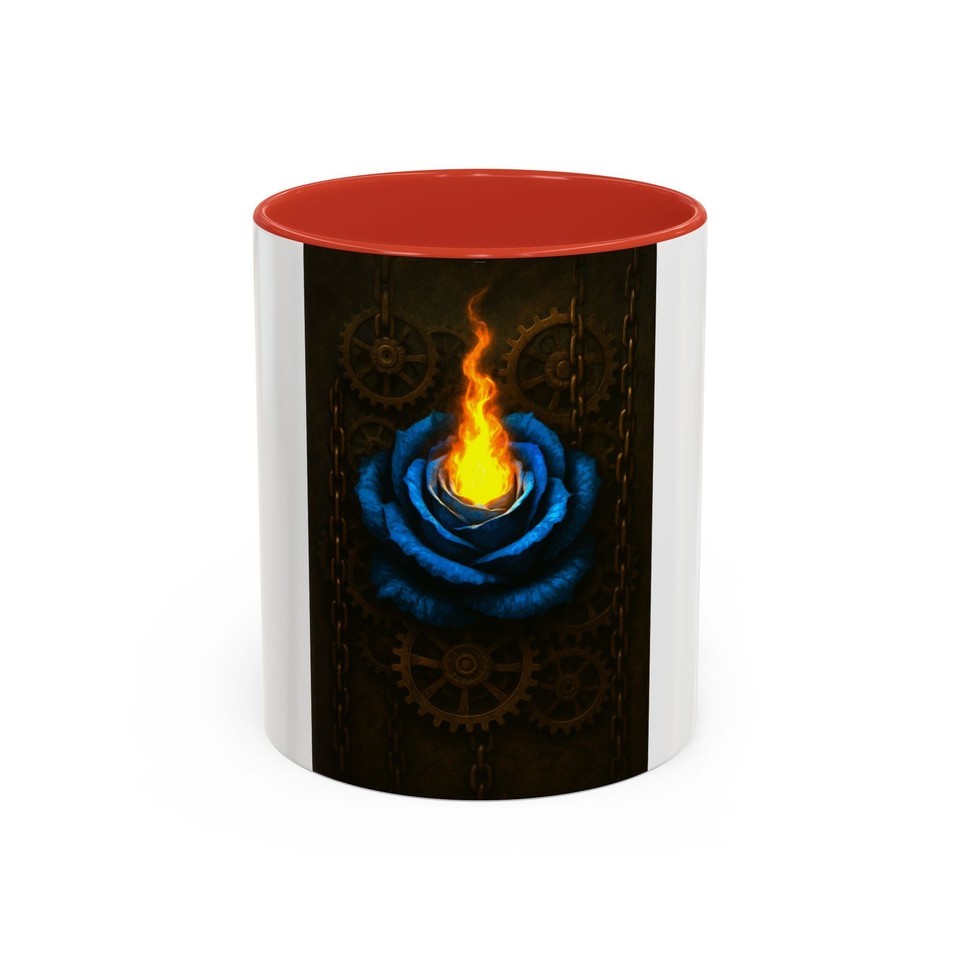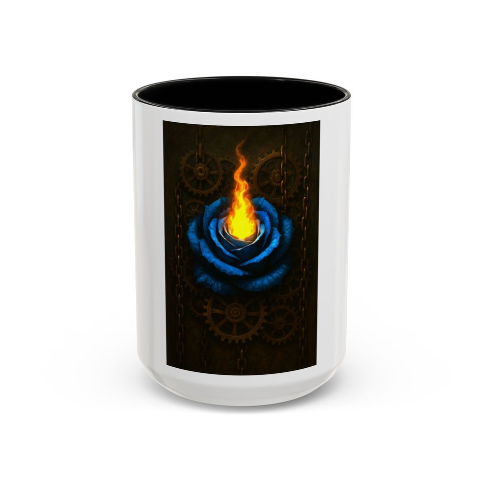 Steep your mornings in a little mystery. This ceramic accent mug holds a quietly dramatic scene ? a cobalt-blue rose cradling a warm, golden flame, set against a backdrop of worn brass gears. It feels like a found object from a clockmaker?s studio or an alchemist?s kitchen: tactile, slightly industrial, and strangely soothing. Hold it in both hands and you get the contrast?the cool blue petals and the living warmth of the fire?like carrying a secret ritual into an ordinary coffee break. It sits well on a cluttered workbench, a late-night writing desk, or the kitchen table where creative projects begin. The glossy finish and bold color interior give the art a gallery-like pop, while the C-shaped handle and balanced weight keep everyday use comfortable. Choose the 11oz for compact sips and the 15oz when you need extra fuel for a long session of making or musing.