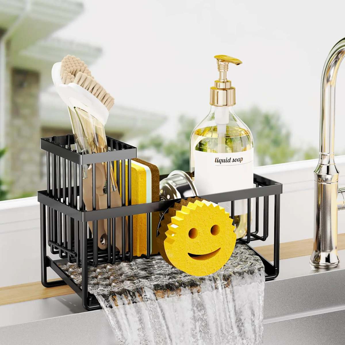 [?Self-draining Design?Innovative sink sponge holder are designed with sloped and self-draining which can drains water into the sink effortlessly.Compared to a manual traythis automatic drainage system allows us to save more cleaning time.It also ensures that countertops stay cleandry and tidy at all times ?Combined With Smiley Design?Different from normal simple kitchen sponge holderTaugast kitchen sink organizer specifically improved the style by adding smiley face design to increase storage spacewhich can be holding the smiley face spongenot only in the appearance of more personalized but also practicality ?Non-slip Bottom Design?In order to prevent the sink organizer from moving during usethis sponge holder adds non-slip pads on the bottom to ensure it secures firmly on the counter.Meanwhilethe non-slip mats also prevent the dish sponge holder from scratching the countertop ?Large Capacity Saving Space?The measure of kitchen caddy sink organizer is 9.5"*4"*6.3"which is suitable for kitchens with limited space.It can be used for storing hand sanitizerspongesdish brushessoapand sink stopper etc.Saving space and keep your kitchen counter far more cleaner and tidy ?Rustproof Multifunctional?Taugast upgraded soap holder is made of premium 304 stainless steel material and black painted protective surfacewhich is rustproofwaterprooffingerprint-resistantdurablestrong load-bearing.Great for kitchenbedroomsbathroomsgarages to store bathroom cleaning toolscosmeticstoolsetc USPTO Patent Pending]