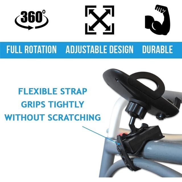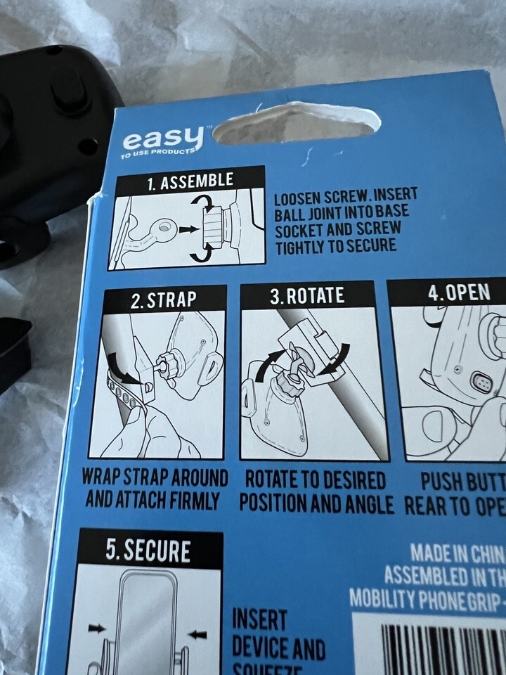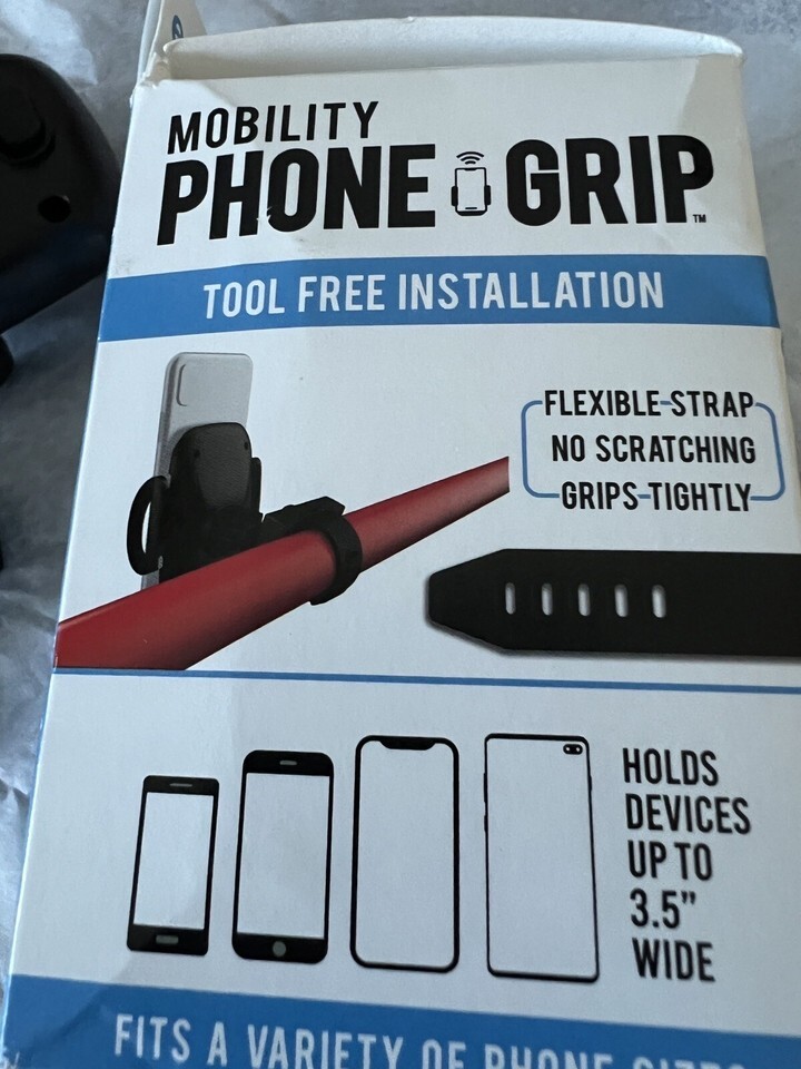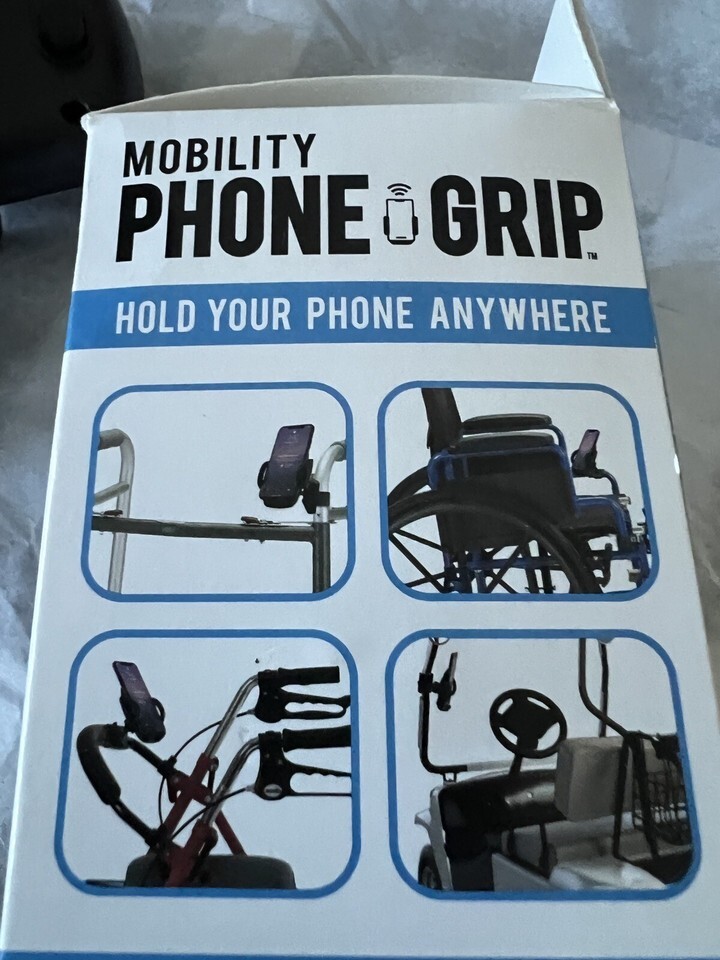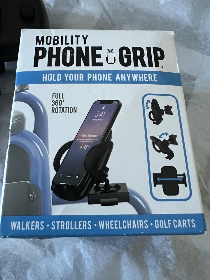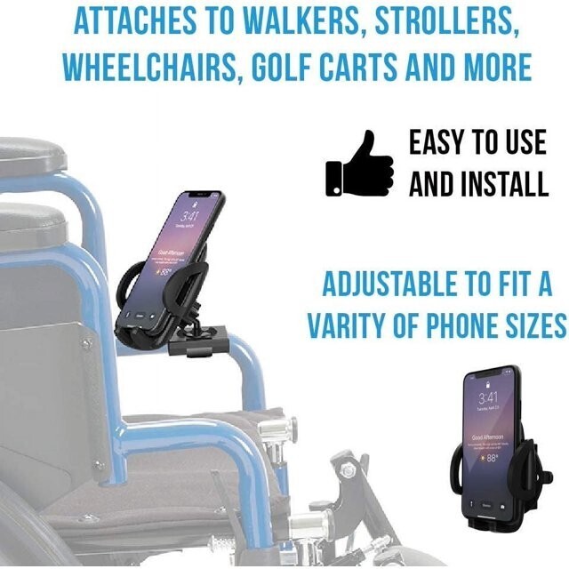 About this item ?HOLDS MANY PHONE SIZES: This mobile phone grip can hold several different smartphones of varying sizes (the opening expands up to 3.5" wide). The grip can keep your phone safe and secure no matter where you go or what you attach it to. ?360-DEGREE ROTATION: This versatile grip can rotate 360 to accommodate all kinds of placements. Simply mount the grip on a surface of your choosing and then rotate it in any direction. ?MOUNTS ON WHEELCHAIR: This mobile cell phone grip comes equipped with heavy-duty clips that can mount onto a wheelchair for easy access, making it ideal for elderly or disab individuals. ?VERSATILE STRAPS: The durable straps included with this phone grip make it easy to attach to most walkers, wheelchairs, or other mobility equipment for seniors and the disab. The strap wraps around surfaces up to 1.25" in diameter. ?TS: We believe in making daily life easier, developing products for seniors. Our products span a variety of categories, including home medical, daily living aids, and more!