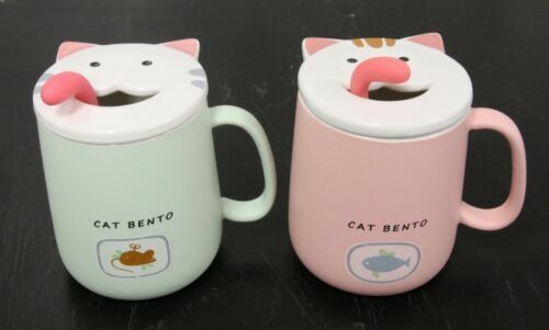 Set of 2 Pink Green Drooling Cat Bento Porcelain Mug Cup With Spoon And Lid