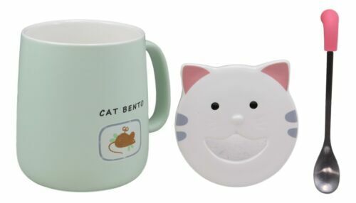 Set of 2 Pink & Green Drooling Cat Bento Porcelain Mug Cup With Spoon And Lid