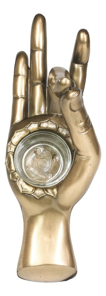 ? This Shunya Mudra Buddha Palm Votive Candle Holder Figurine is made of high quality polyresin, individually hand crafted and painted. Color tone may vary from picture.