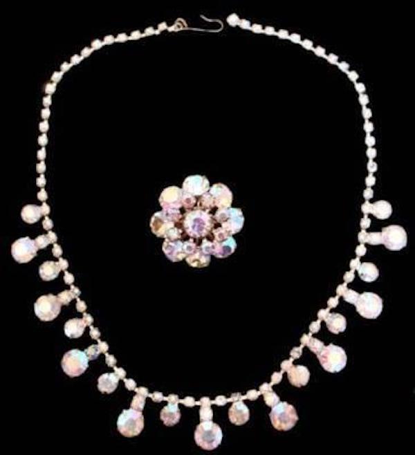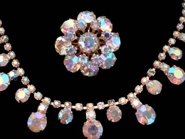 Beautiful vintage fiery aurora borealis rhinestones necklace and matching brooch with prong-set stones. The vintage necklace is 15? long x 3/4? wide and the matching brooch is 1 1/8? x 1 1/8?. Both are in excellent condition. They have an unusual goldtone backing.