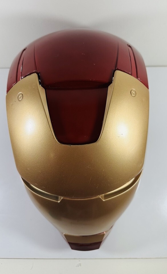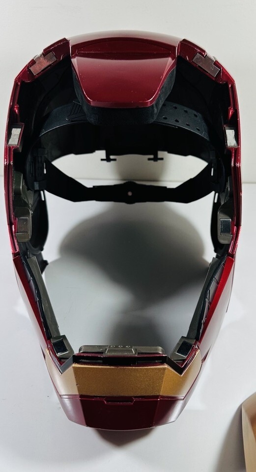 This Hasbro Marvel Legends Iron Man electronic helmet is in good condition and fully functional. All electronic features work, including light-up eyes and sound effects. The helmet shows normal cosmetic wear from use. It is missing the rear portion of the helmet, but this does not affect functionality, display, or operation of any electronic features.