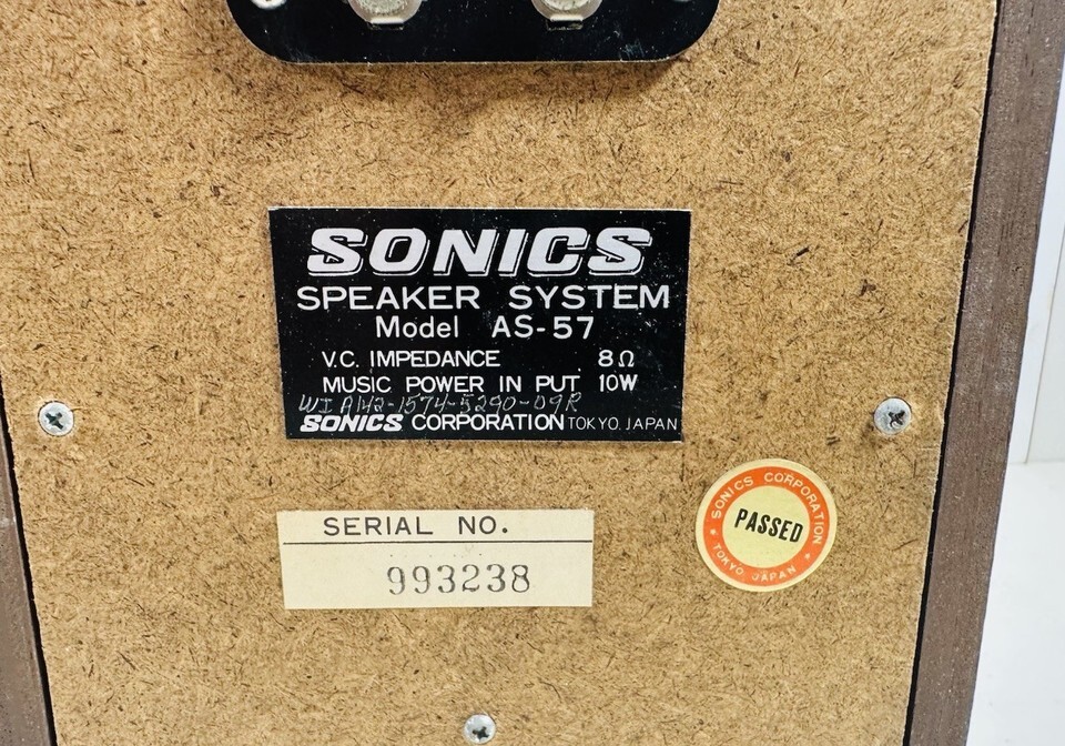 vintage Sonics AS-57 hi-fi, collectible 1960s speakers, retro Sonics stereo, 8 ohm 10 watt pair, tested working audio equipment, classic Japanese speakers, AS-57 vintage stereo, collectible hi-fi pair, retro audio enthusiast gear, Sonics audio collectible