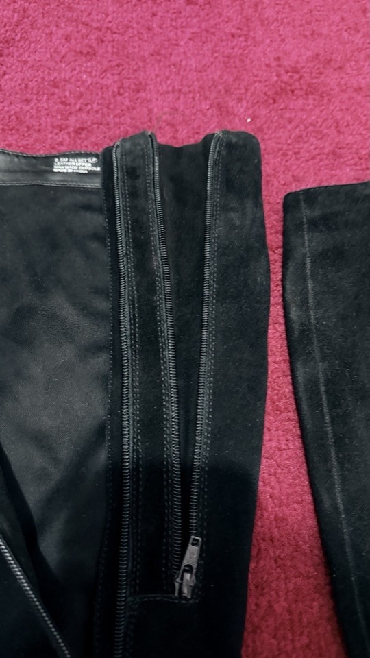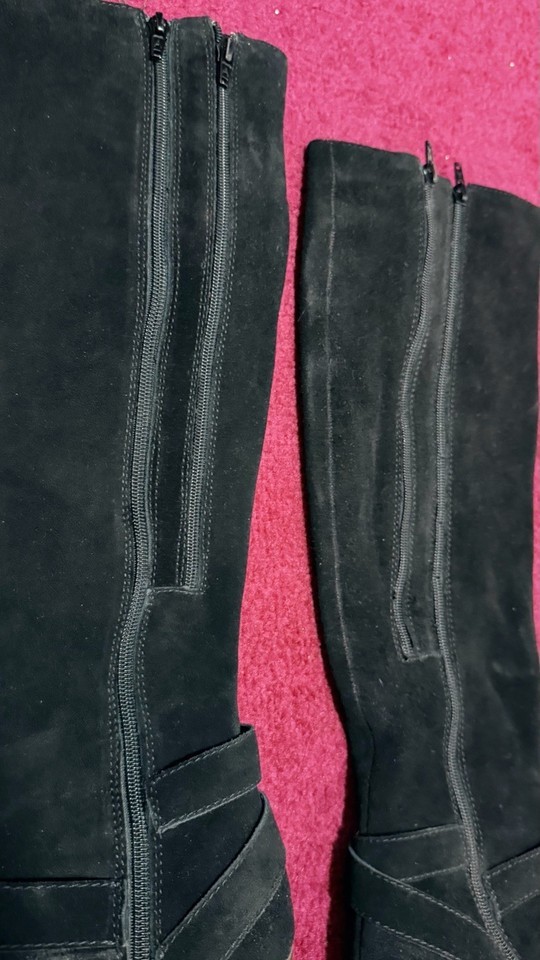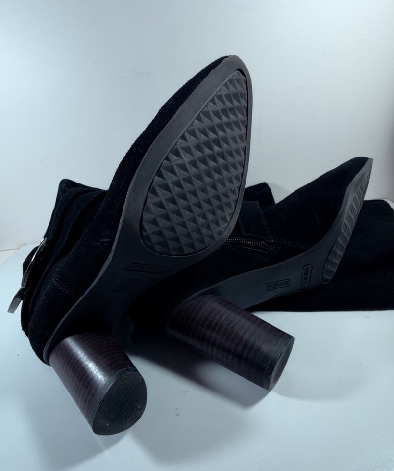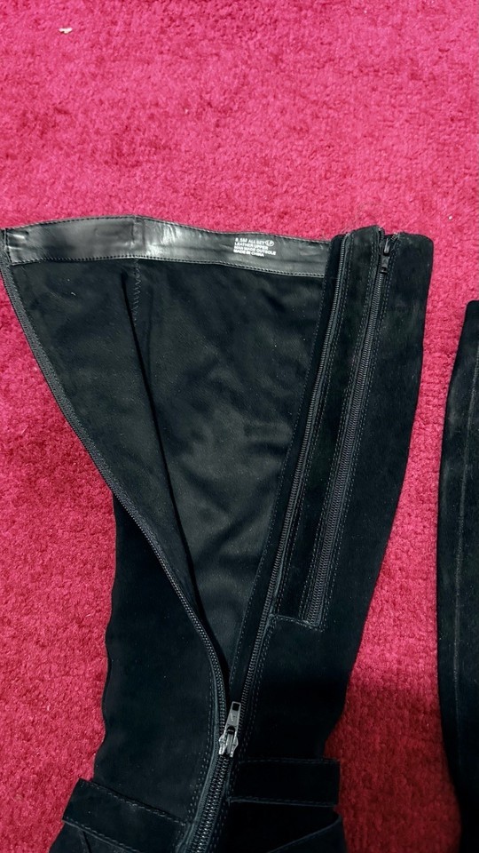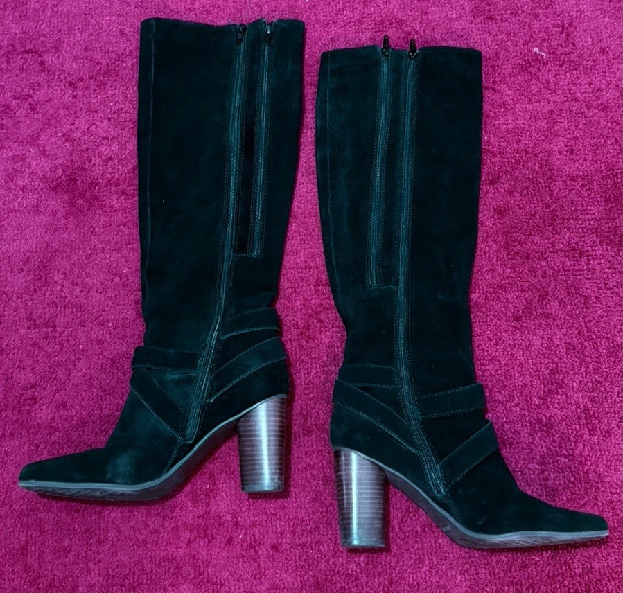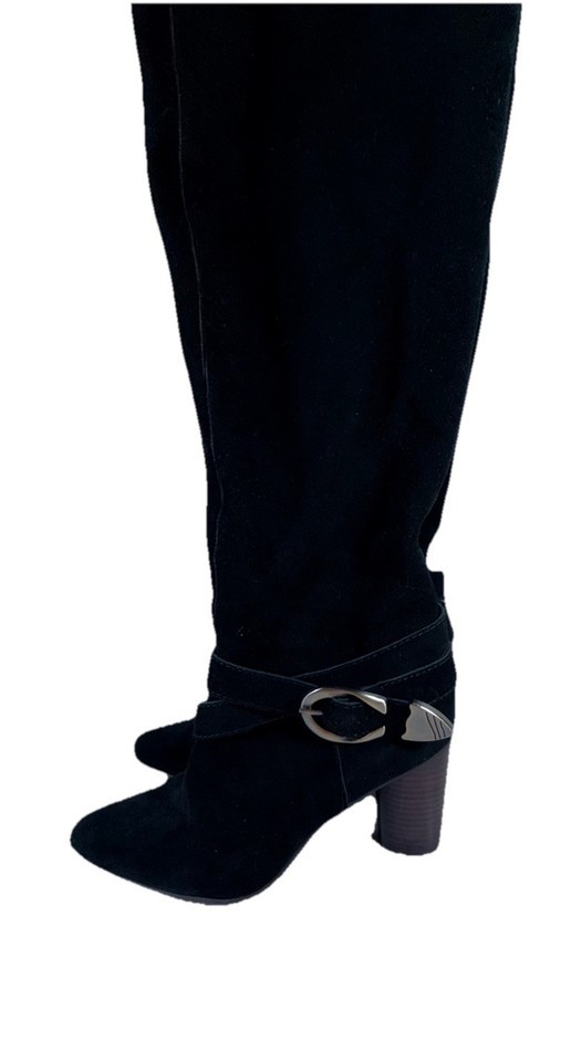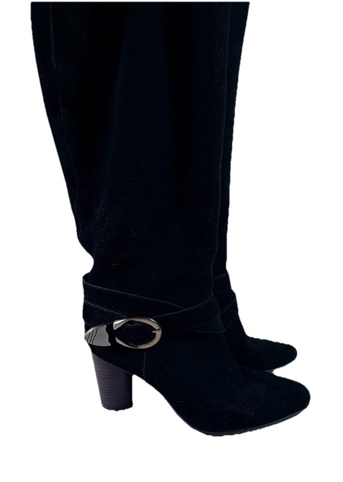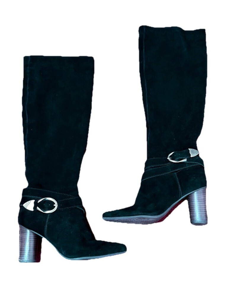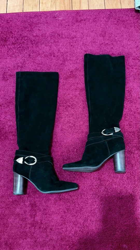black suede knee high boots womens size 8.5 block heel vintage style buckle tall boots fashion footwear