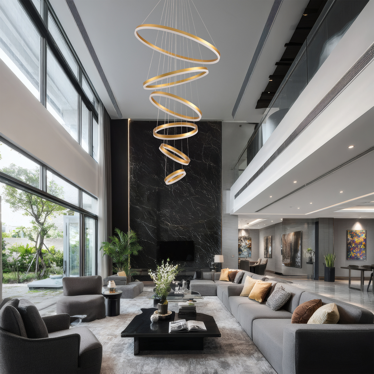 High-ceilinged spaces such as living rooms, foyer, and shopping malls |