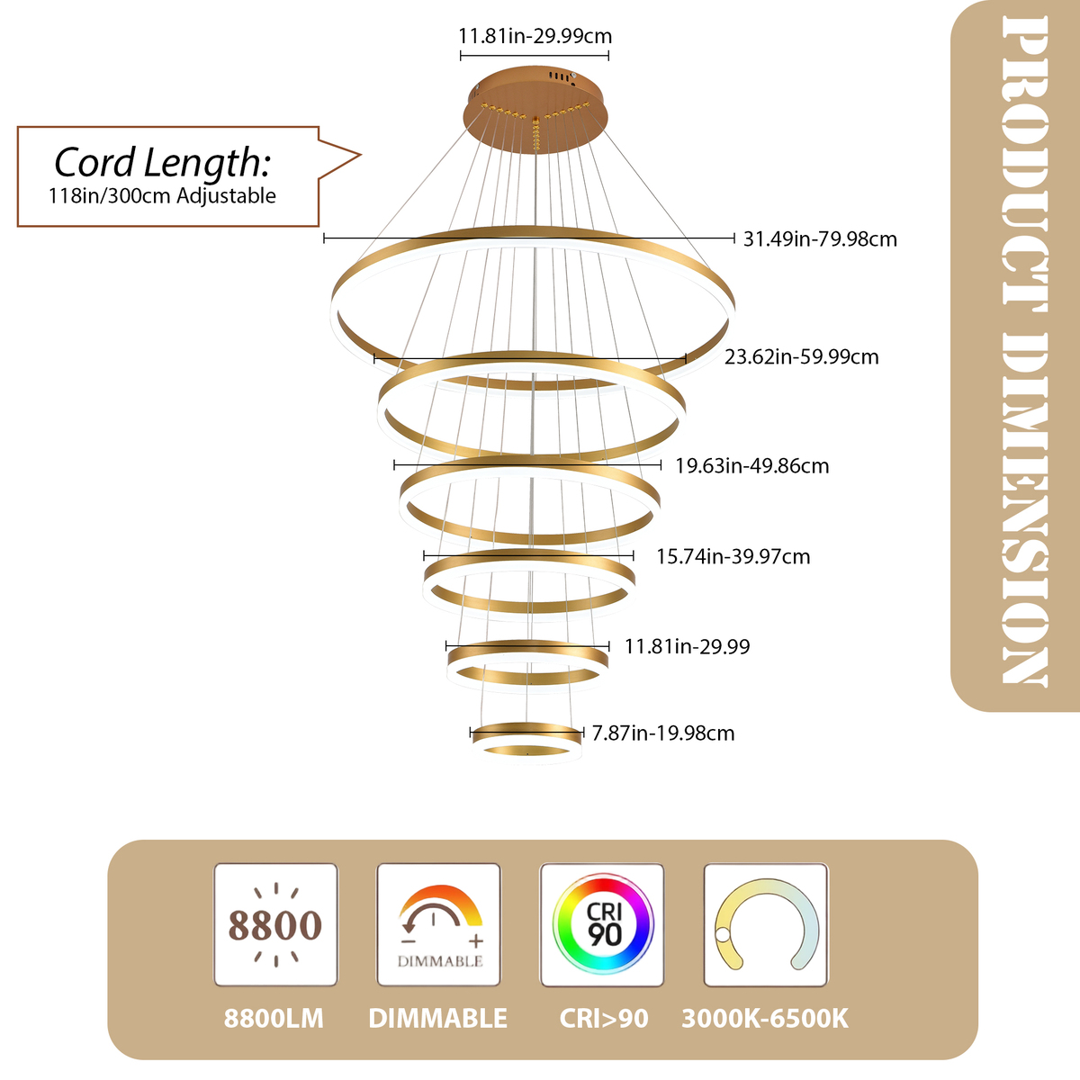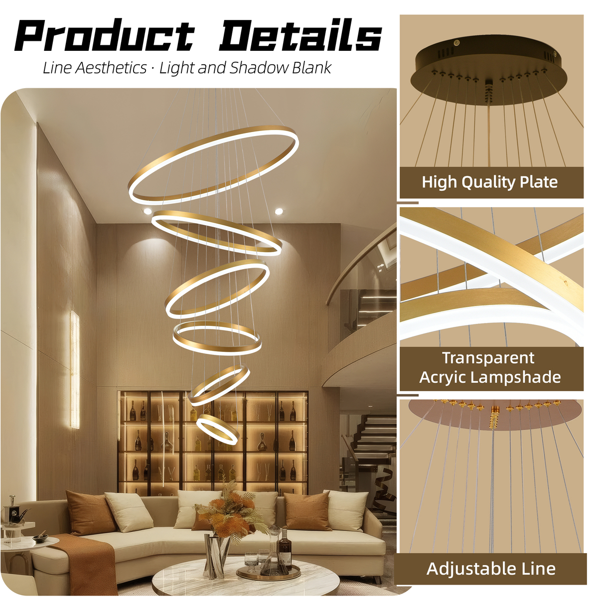 6-Rings Modern LED Chandelier Gold Dimmable Pendant Light for Foyer Living Room