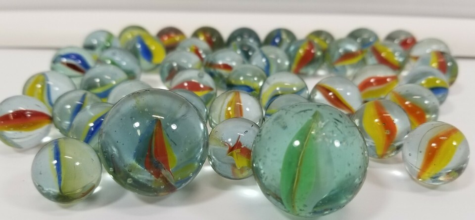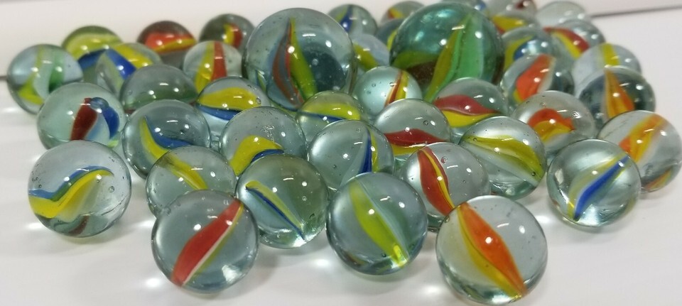 Marbles measure about 1/2" in diameter with 2 large marbles of approximately 3/4" diameter