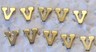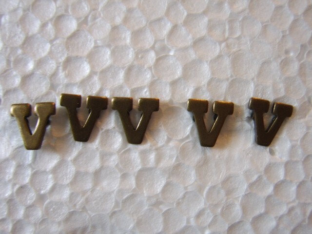 Dealer lot of 5 ribbon attachment letters "V" for U. S. Military medals. Letter "V" is designation for valor. Device is about 1/4 inch high and is bronze type material construction.