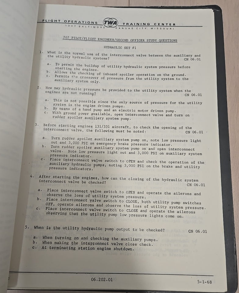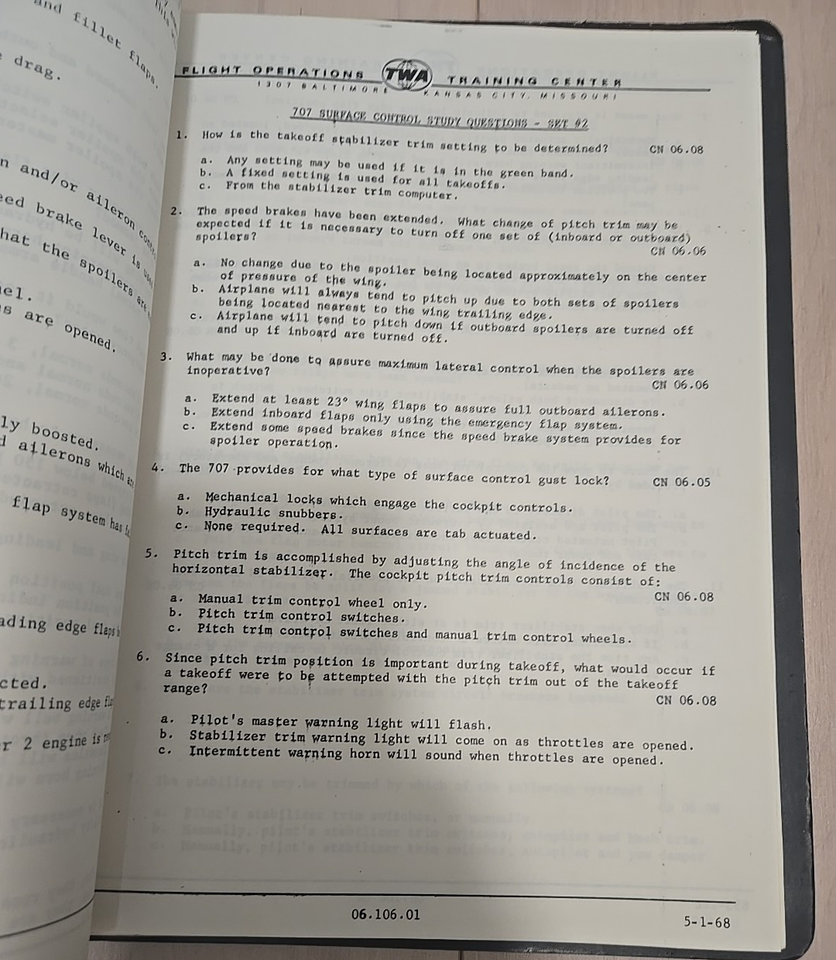 The letterhead of the pages indicate the manual was used at TWA's Flight Operations Training Center, which was located at 1307 Baltimore, Kansas City, Missouri.
