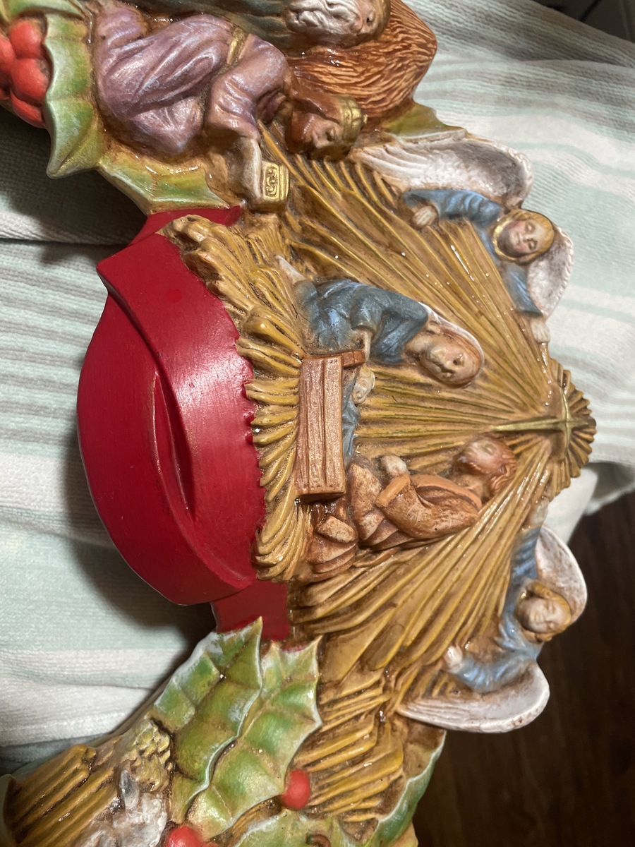 Vintage Nativity Christmas Wreath – Hand Painted Resin Religious Holiday Decor (