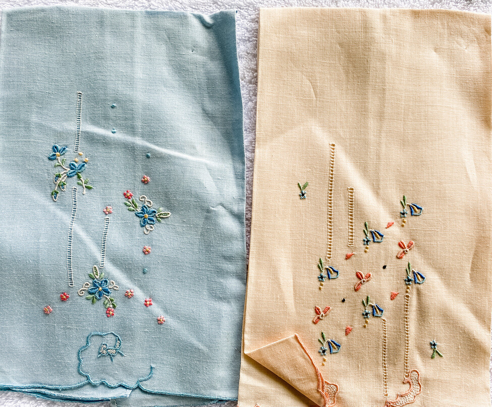Vintage Madeira Linen Hand Embroidered FingerTip Towels Provenance Unused Pastel