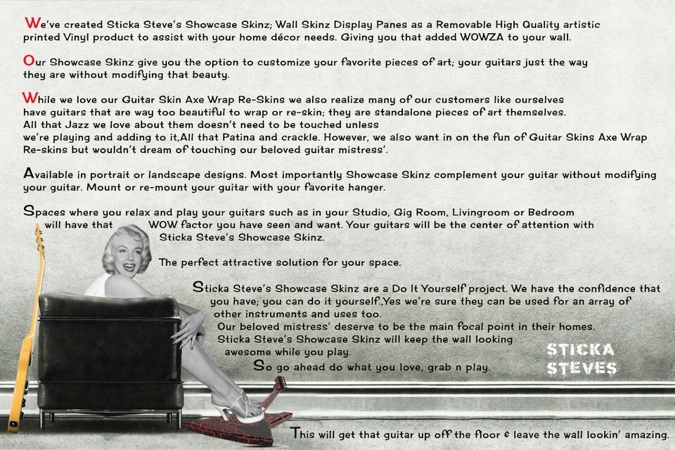 We?re confident that you can Do It Yourself; therefore, we offer you Showcase Skinz to help you achieve your goal of displaying your beautiful guitars as a main focal point.