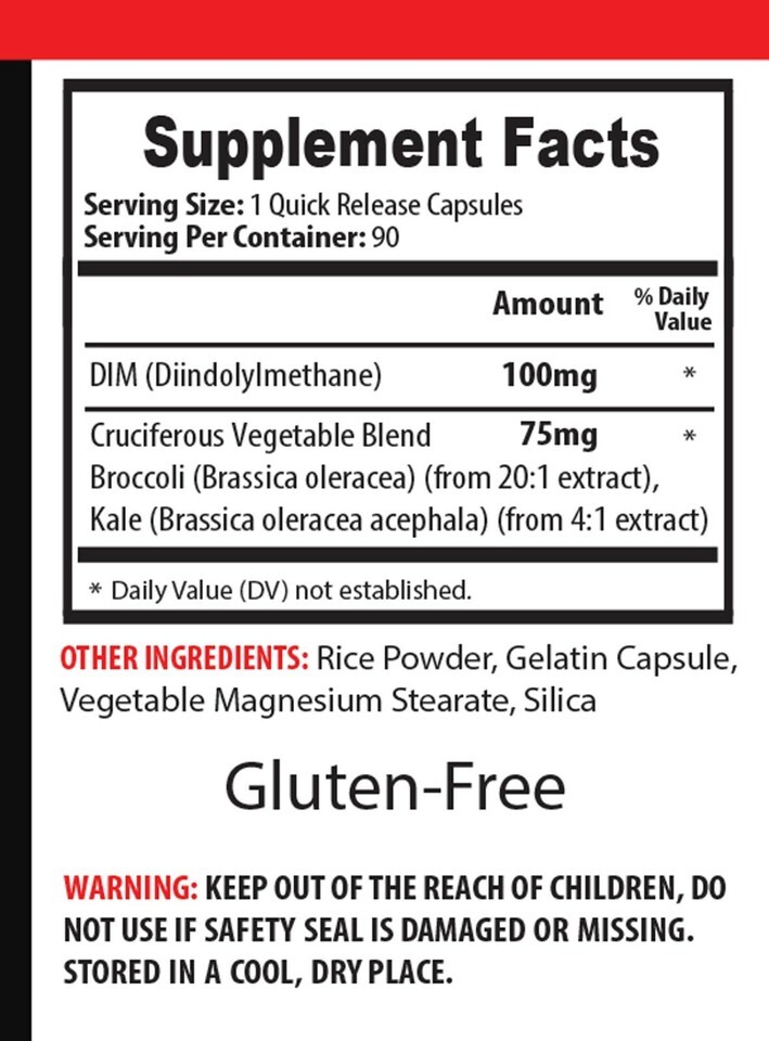 DIINDOLYMETHANE (DIM): Diindolylmethane (DIM) is a natural substance produced in your gut after eating cruciferous vegetables such as broccoli and has been shown to be effective for many health problems in adults. Our supplement contains 100MG of DIM and 75MG of Cruciferous Vegetable Blend.