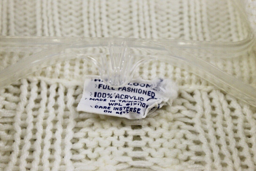 Label History: Acrylic knitwear surged in popularity during the 1970s for its durability, easy care, and affordability compared to wool. Cable-knit cardigans were staple pieces, often styled for collegiate or ?schoolgirl? looks that remain popular in vintage styling today.